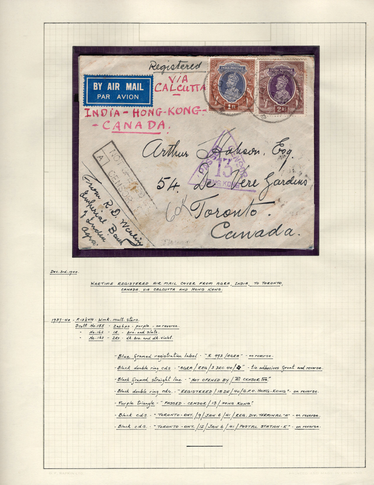 Kong / 9" triangular handstamp in green (type 3, recorded used between MAY.30.1940 and DEC.18.1940) and a "OPENED BY CENSOR / 90 C" Indian re-sealing tape. Back shows a Victoria / Kong Kong AUG.19.1940 double circle transit. A very fine and colourful