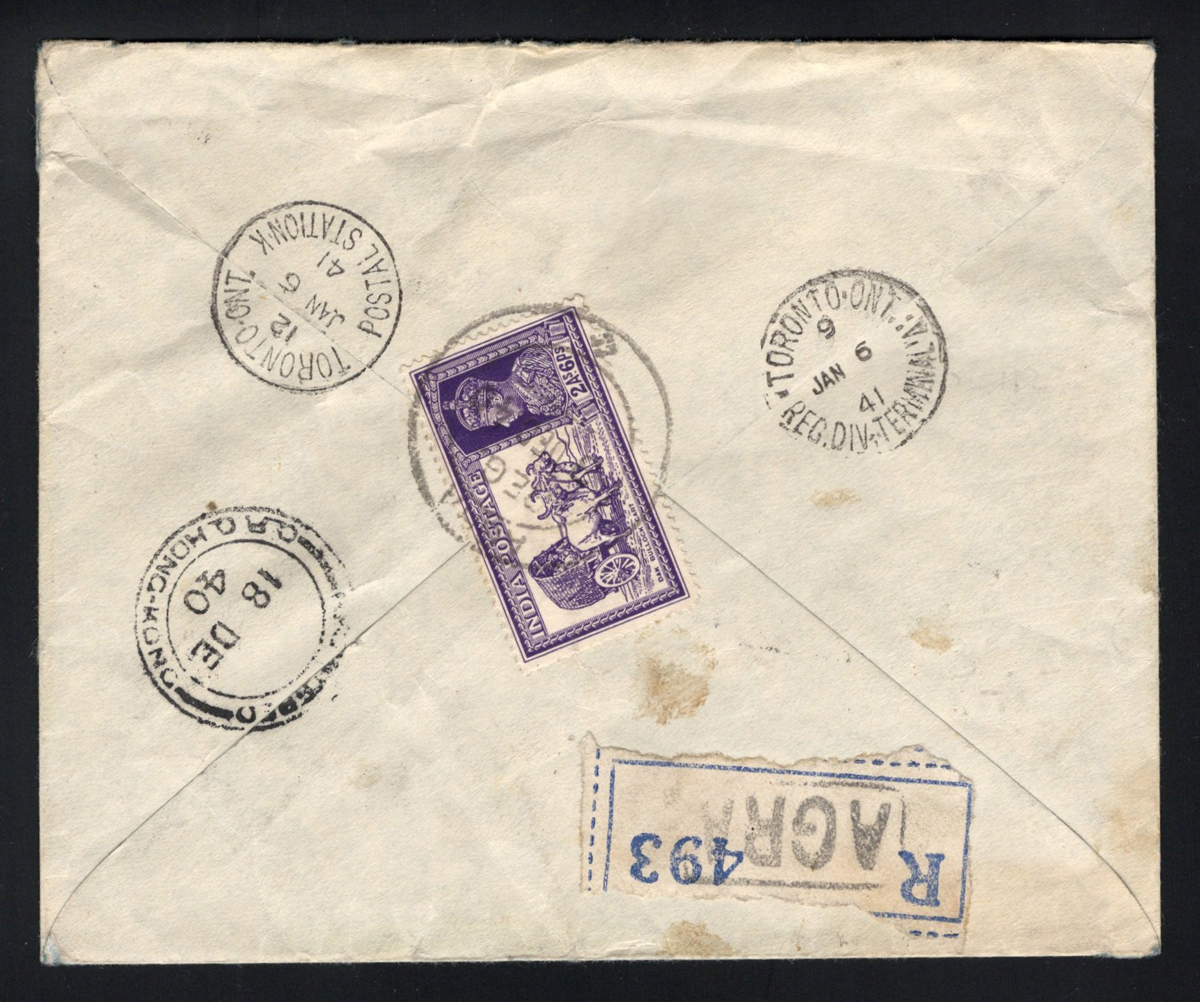 Registered Airmail Cover to Canada, franked with 2 India stamps (1r and 2r) on front, and a 2a6p stamp on back, all tied to cover by Agra DEC.3.1940 c.d.s. cancels, endorsed "Via Calcutta, India - Hong Kong - Canada". The cover also shows a