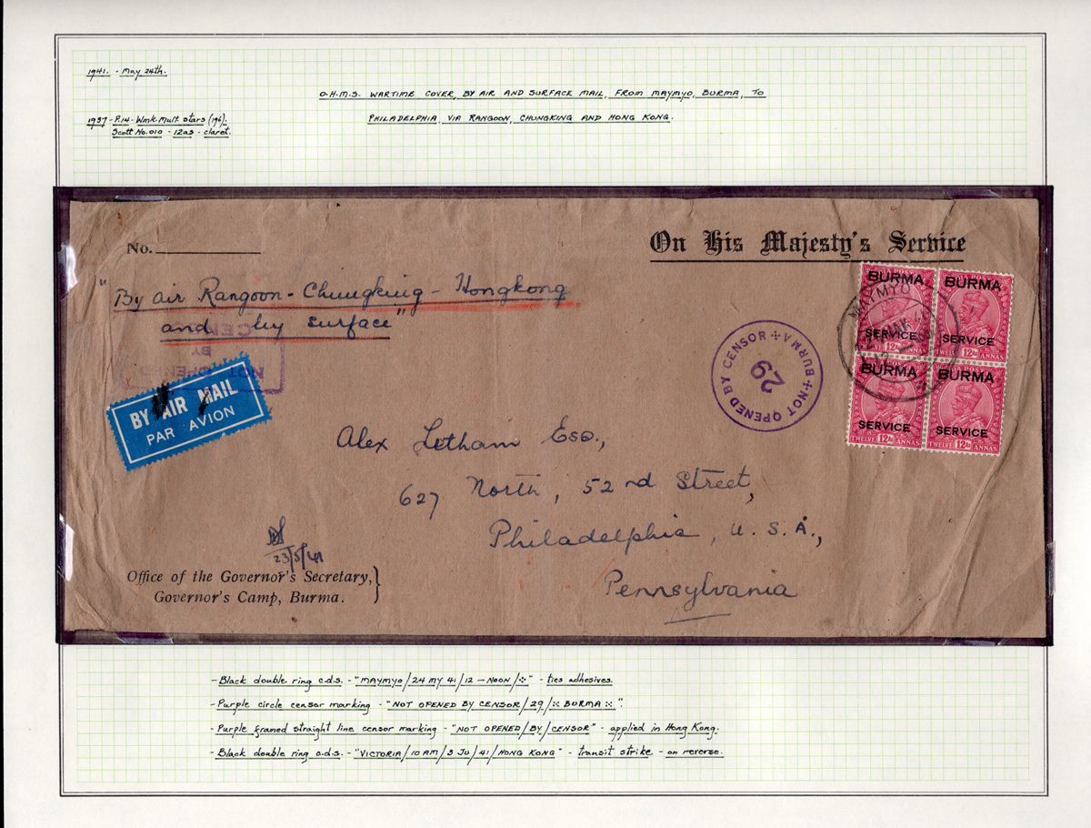 Airmail O.H.M.S. Cover to the United States, a legal sized "Office of the Governor's Secretary" cover franked with a block of four of the 12a KGV India issues overprinted "BURMA / SERVICE", tied to cover by a Maymyo MAY.24.1941 double circle