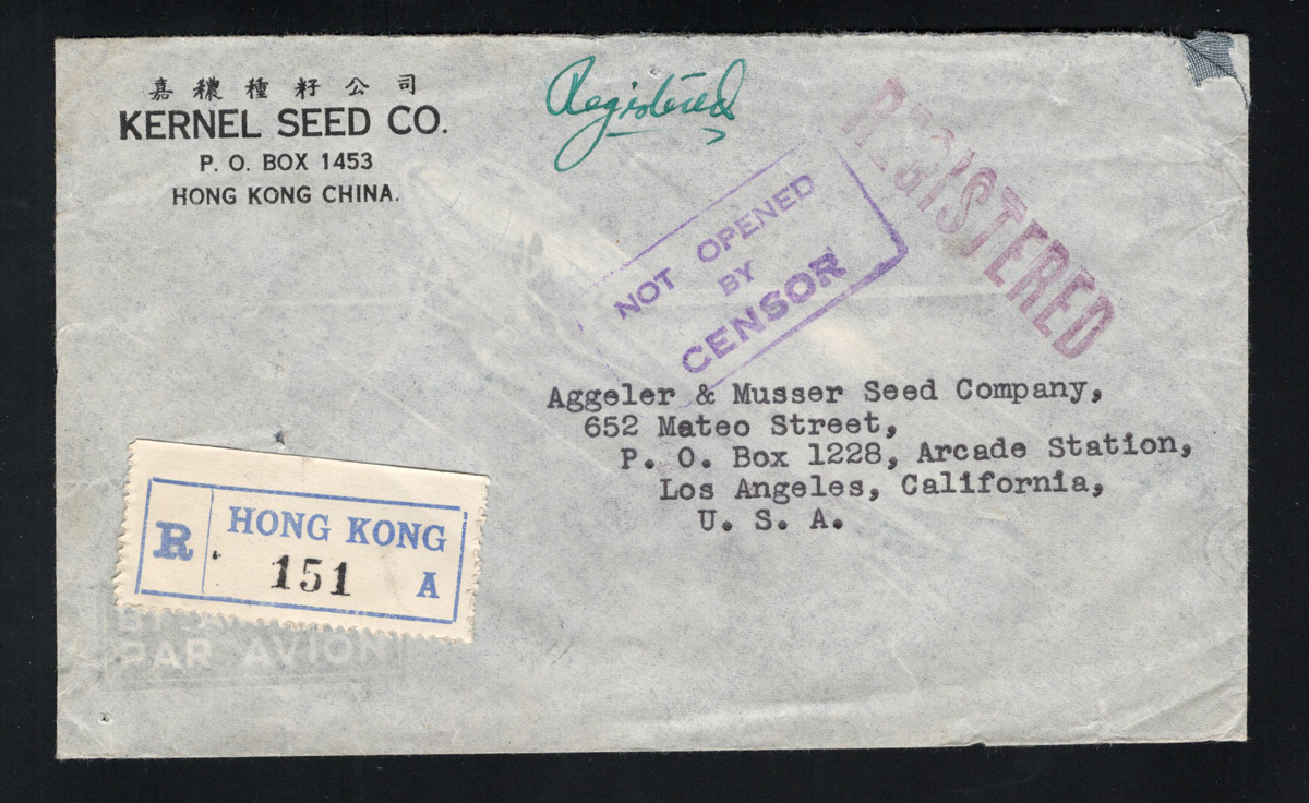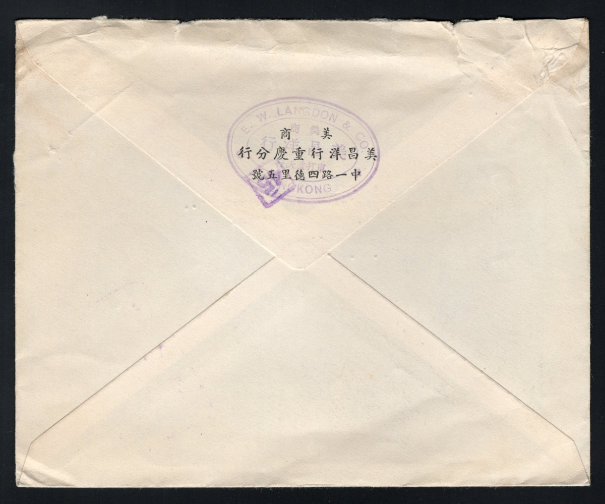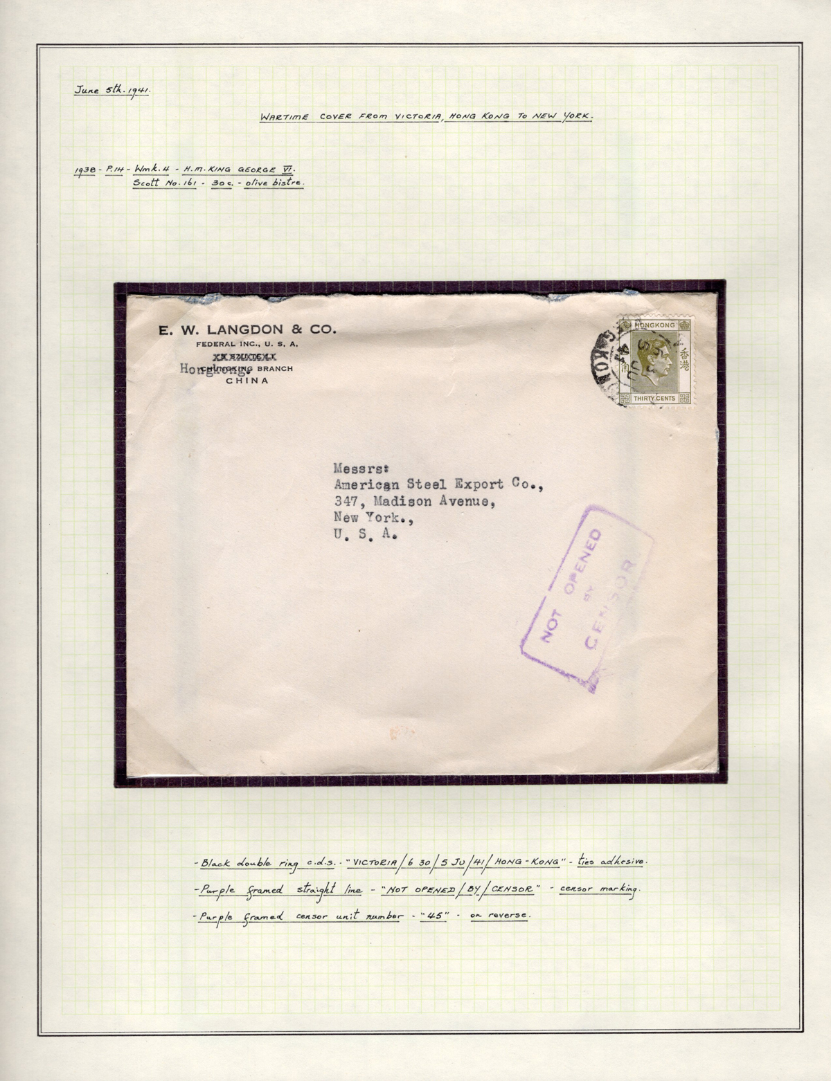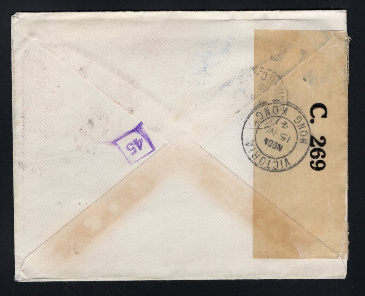 small boxed "45" censor number in purple and a "E. Langdon & Co. / Hong Kong business logo on backflap, overall very fine. (Scan 1)