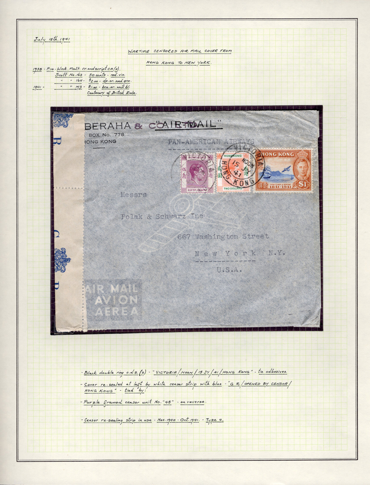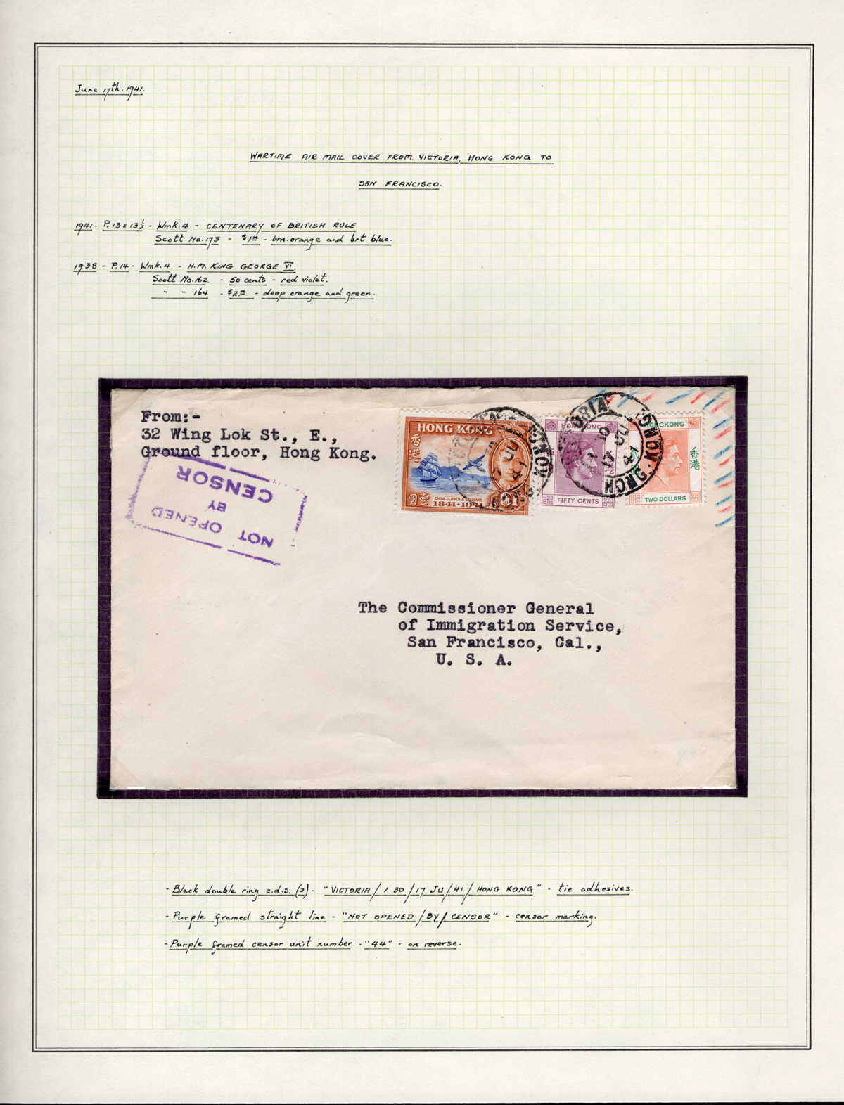 Kong Cover to the United States, a hand drawn airmail cover franked with three Hong Kong issues totaling $3.50, all tied to cover by two Victoria / Hong Kong JUN.17.1941 double circle cancels. The cover has a boxed "NOT OPENED / BY / CENSOR"