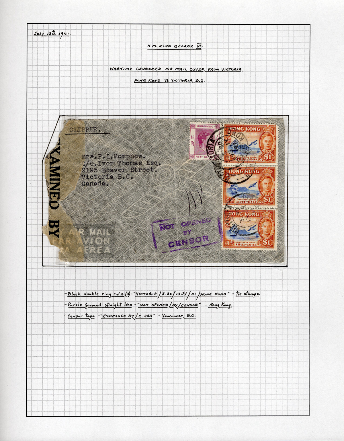 Kong Airmail Cover to Victoria Canada, an illustrated airmail cover franked with four Hong Kong issues totaling $3.50, tied to cover by two Victoria / Hong Kong JUL.13.1941 double circle cancels, endorsed "Clipper". The cover has a "EXAMINED BY /