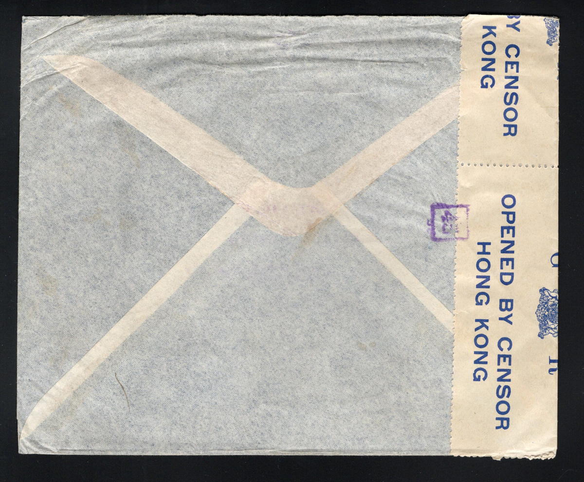 Kong Cover to the United States, a legal sized cover franked with three Hong Kong issues totaling 45c, tied to each other by a Victoria / Hong Kong OCT.2.1941 double circle cancel. The cover has a "OPENED BY CENSOR"re-sealing tape, and back shows