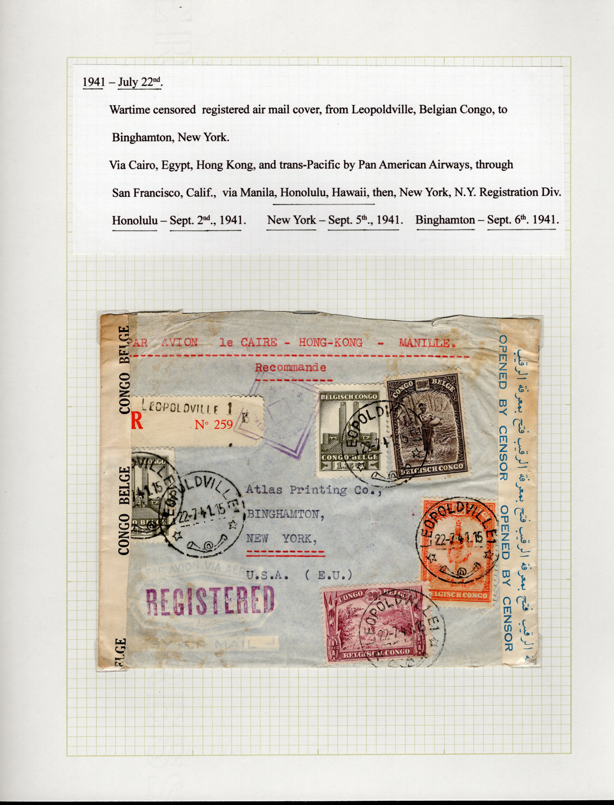 Congo Airmail Registered Cover to the United States, franked with five Belgian Congo stamps, all tied to cover by Leopoldville JUL.22.1941 c.d.s. cancels, endorsed "Par Avion le Caire - Hong Kong - Manille.". The cover has a Belgian Congo