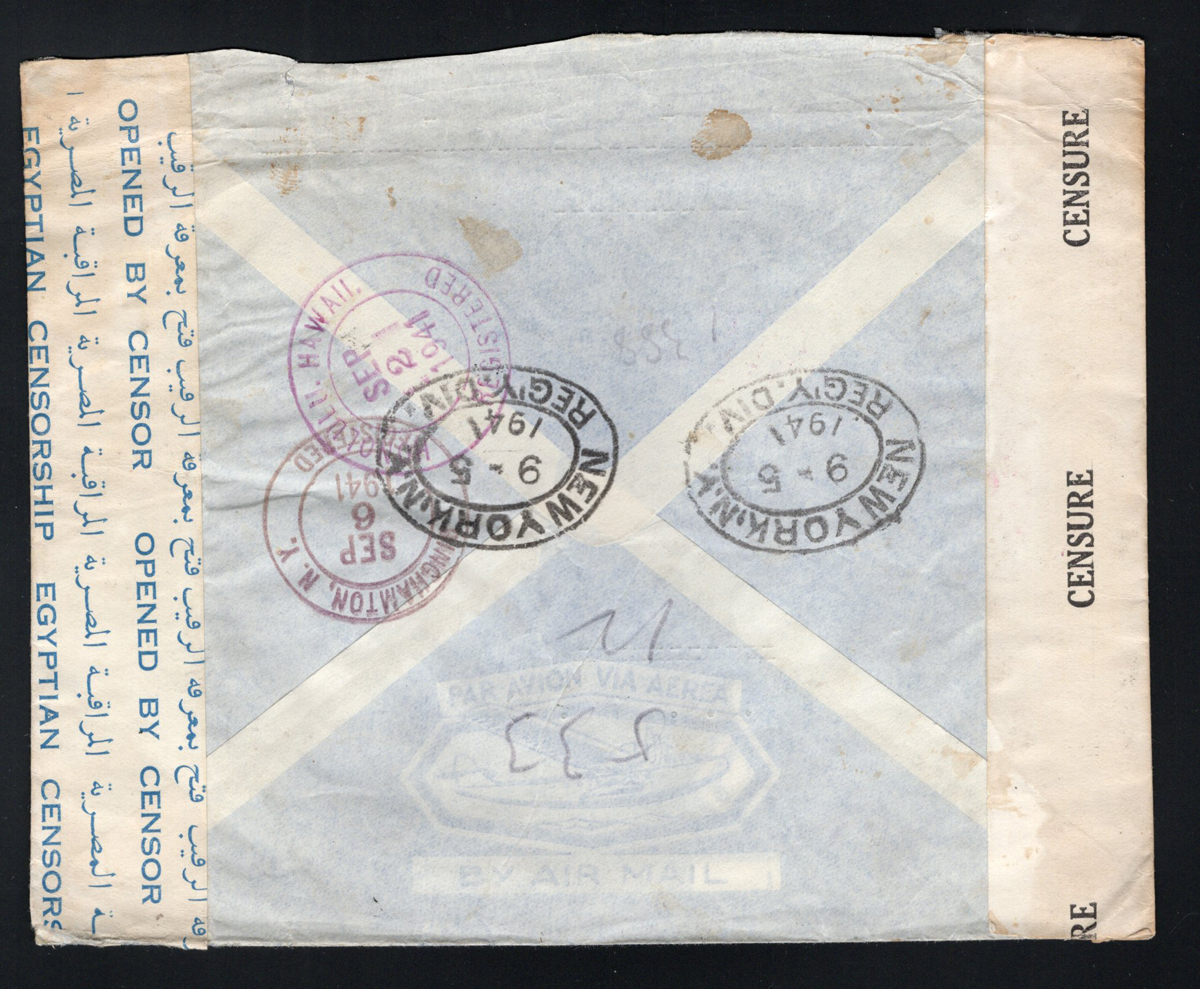 re-sealing tape at left and a bilingual Egyptian re-sealing tape at right, plus a boxed Egyptian bilingual censor handstamp in purple. Back shows a Honolulu Hawaii SEP.2.1941 double circle transit and two New York SEP.5 transits and a Binghampton