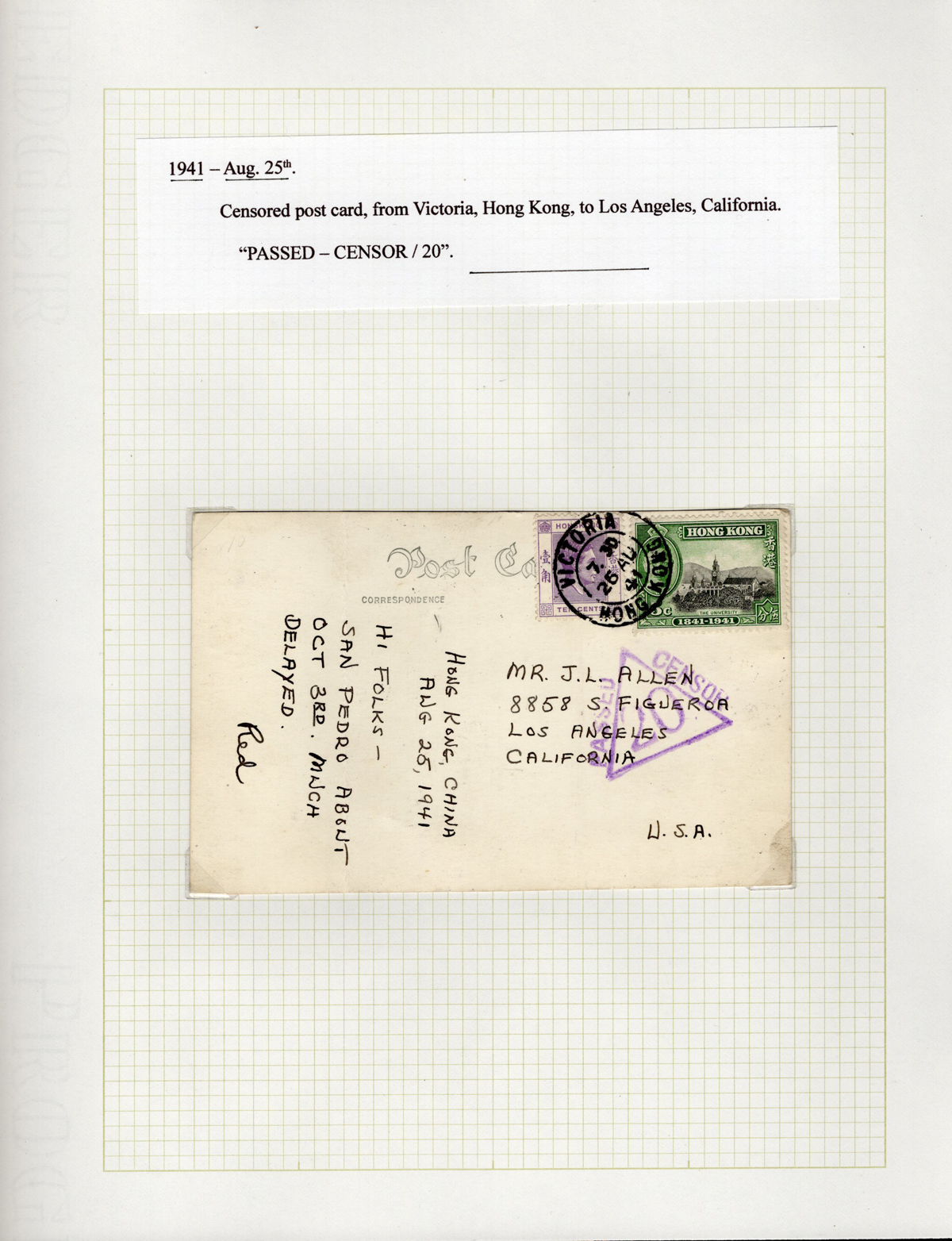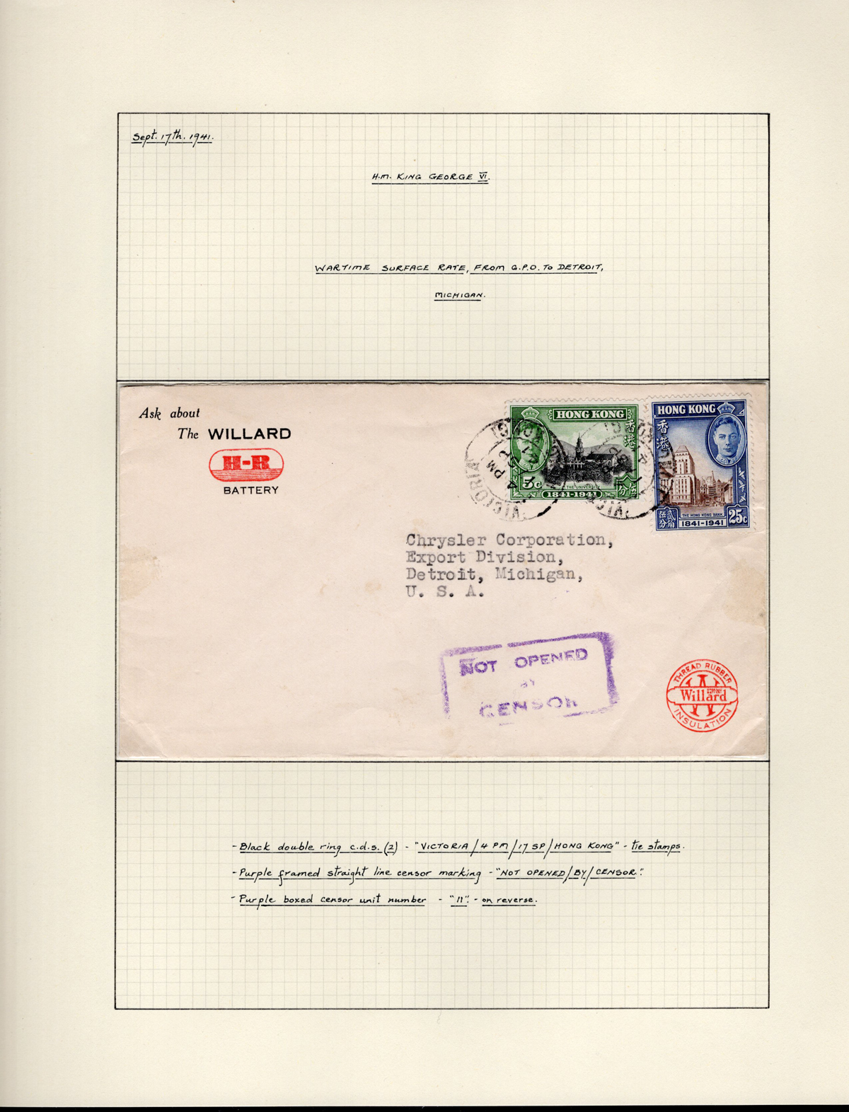 Kong Cover to the United States, an advertising cover franked with two Hong Kong issues totaling 30c, both tied to cover by two Victoria / Hong Kong SEP.17.1941 double circle cancels. The cover has a boxed "NOT OPENED / BY / CENSOR" (type 7C)