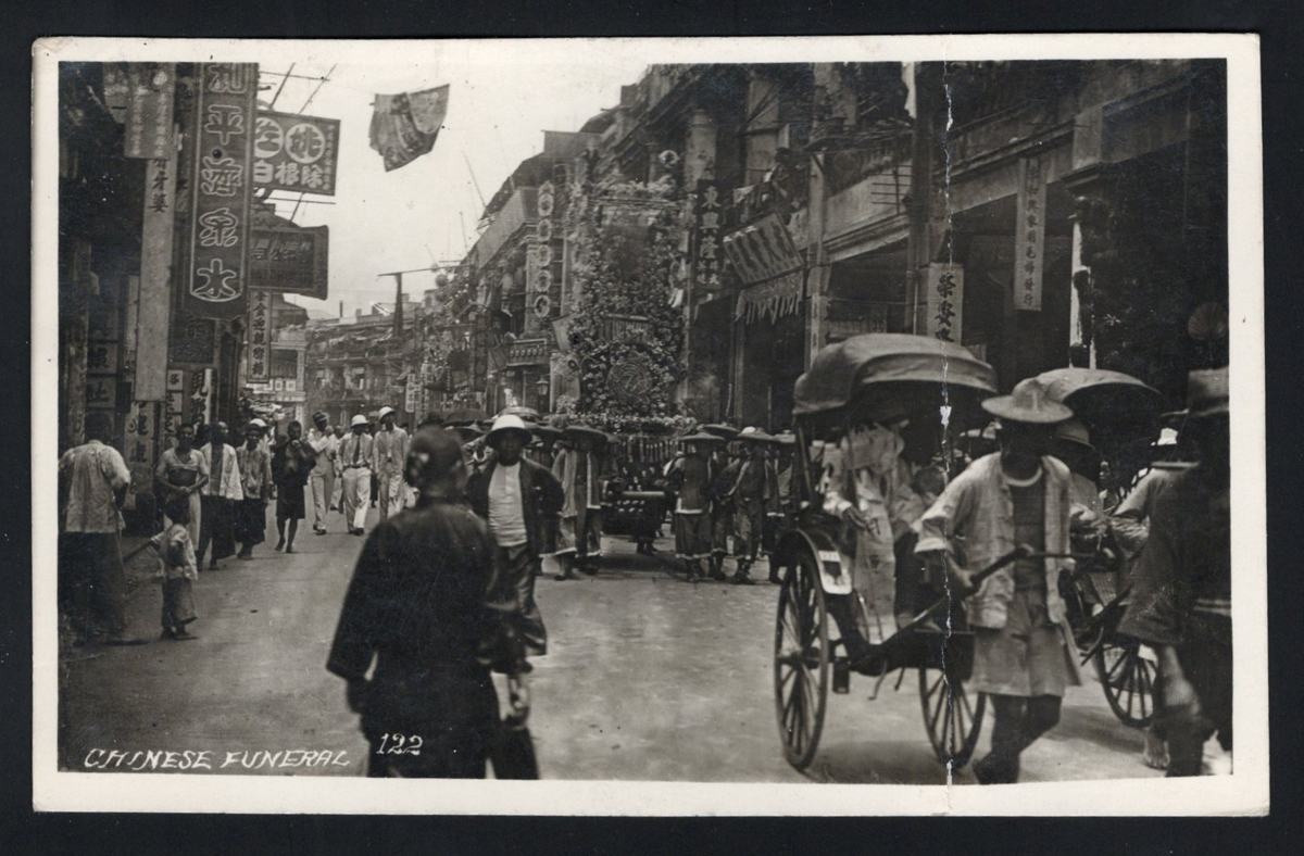 Kong Picture Postcard to the United States, a real photo postcard titled "Chinese Funeral" franked with two Hong Kong issues totaling 15c, both tied to the card by a Victoria / Hong Kong AUG.26.1941 double circle cancel. The card has a "PASSED /
