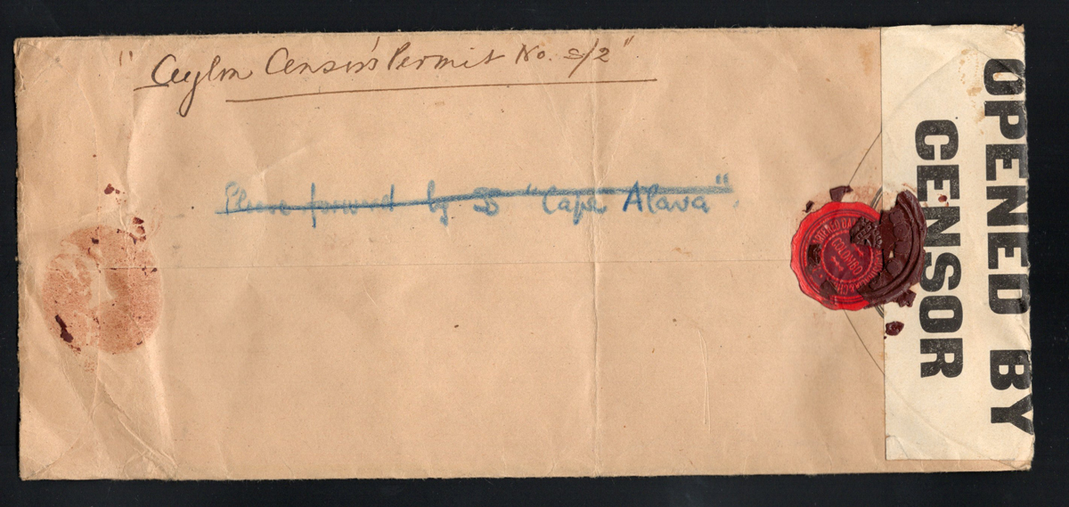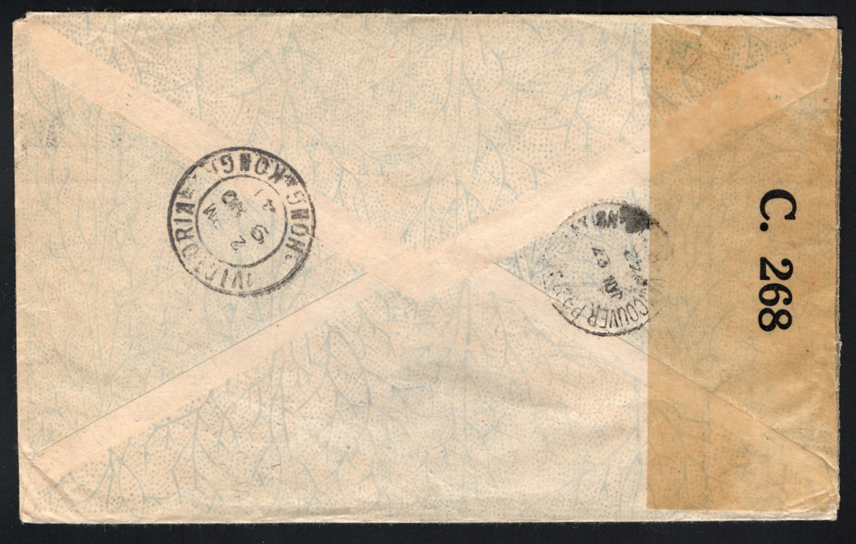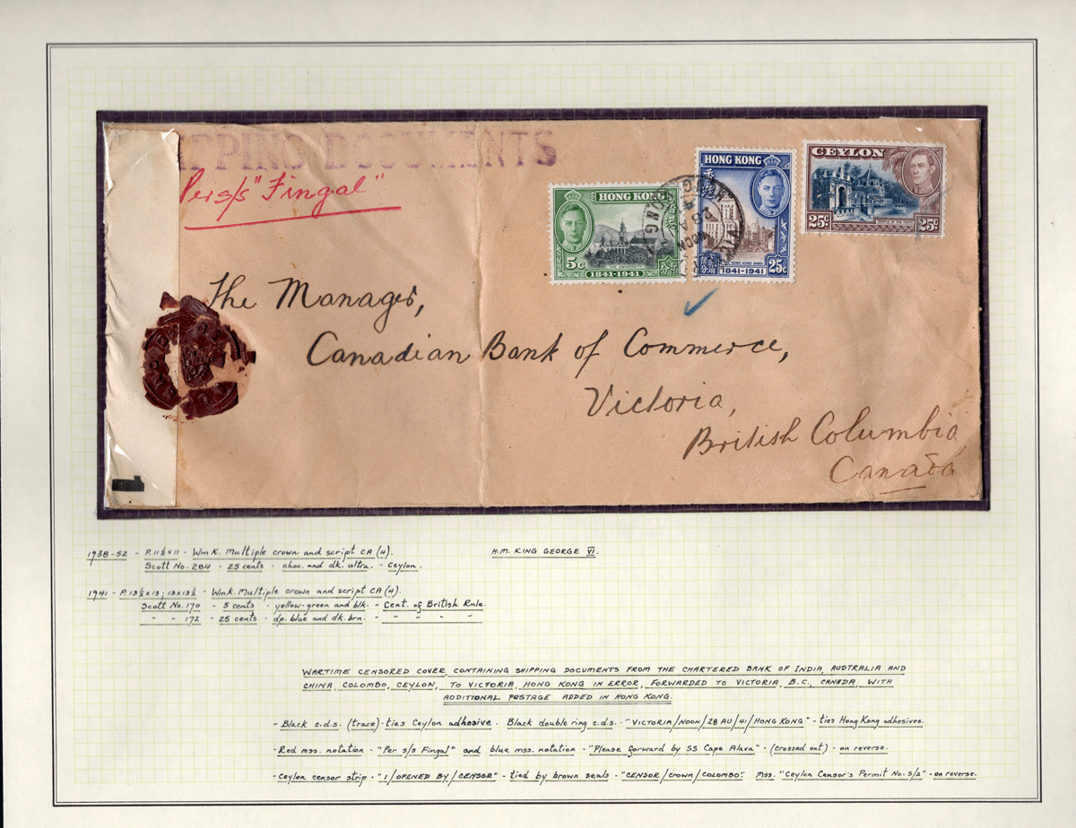 totaling 30c, these two tied to cover by a Victoria / Hong Kong AUG.28.1941 double circle cancel. The cover is endorsed "SHIPPING PAPERS" handstamp, "per S/S Fingal", "Ceylon Censor's Permit No. S/2" and "Please forward by SS Cape Alava" (this