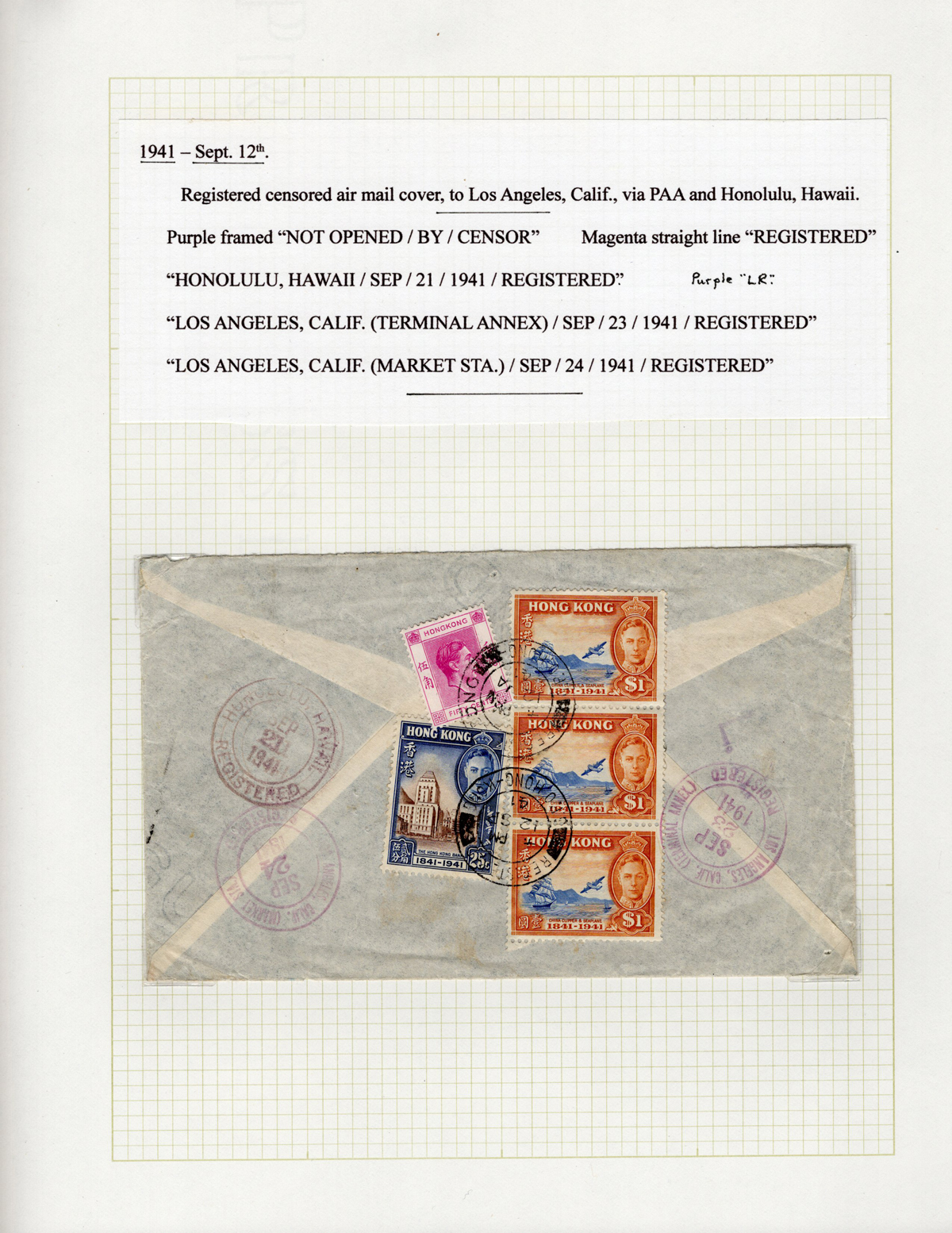 Kong Registered Cover to the United States, franked on back with five Hong Kong stamps totaling $3.75, all tied to each other and to cover by two Registered / G.P.O. Hong Kong SEP.12.1941 double circle cancels. The cover has a boxed "NOT OPENED /