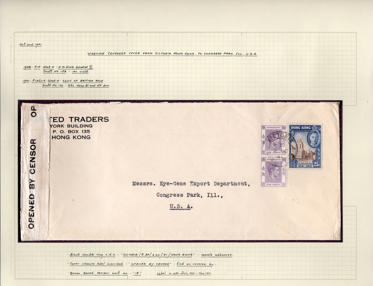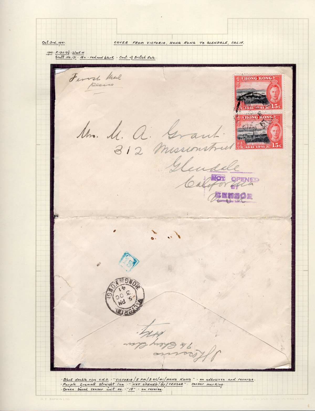 Kong Cover to the United States, franked with two Hong Kong stamps totaling 30c, cancelled by a Victoria / Hong Kong OCT.3.1941 (3PM) double circle cancel. The cover has a boxed "NOT OPENED / BY / CENSOR" (type 7C) handstamp in purple, and back