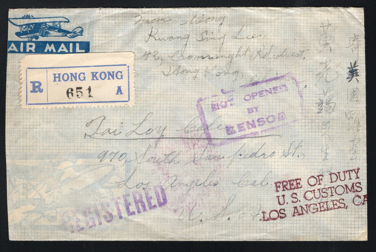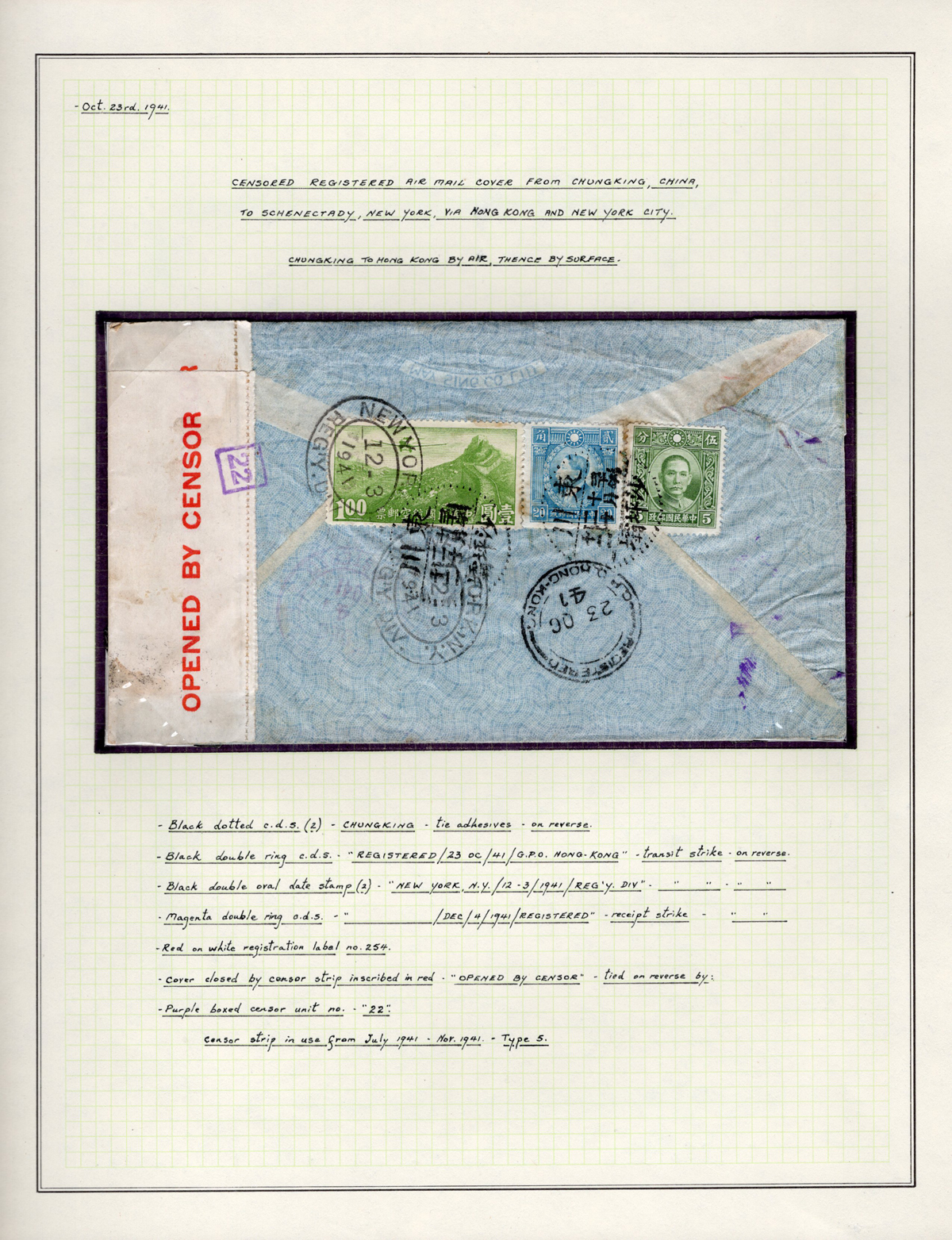 "OPENED BY CENSOR" (in red lettering) re-sealing tape, tied by a small boxed "22" censor unit number in purple on back. Back also shows a Registered / G.P.O. Hong Kong OCT.23.1941 double circle transit and two New York receivers dated DEC.3.1941,