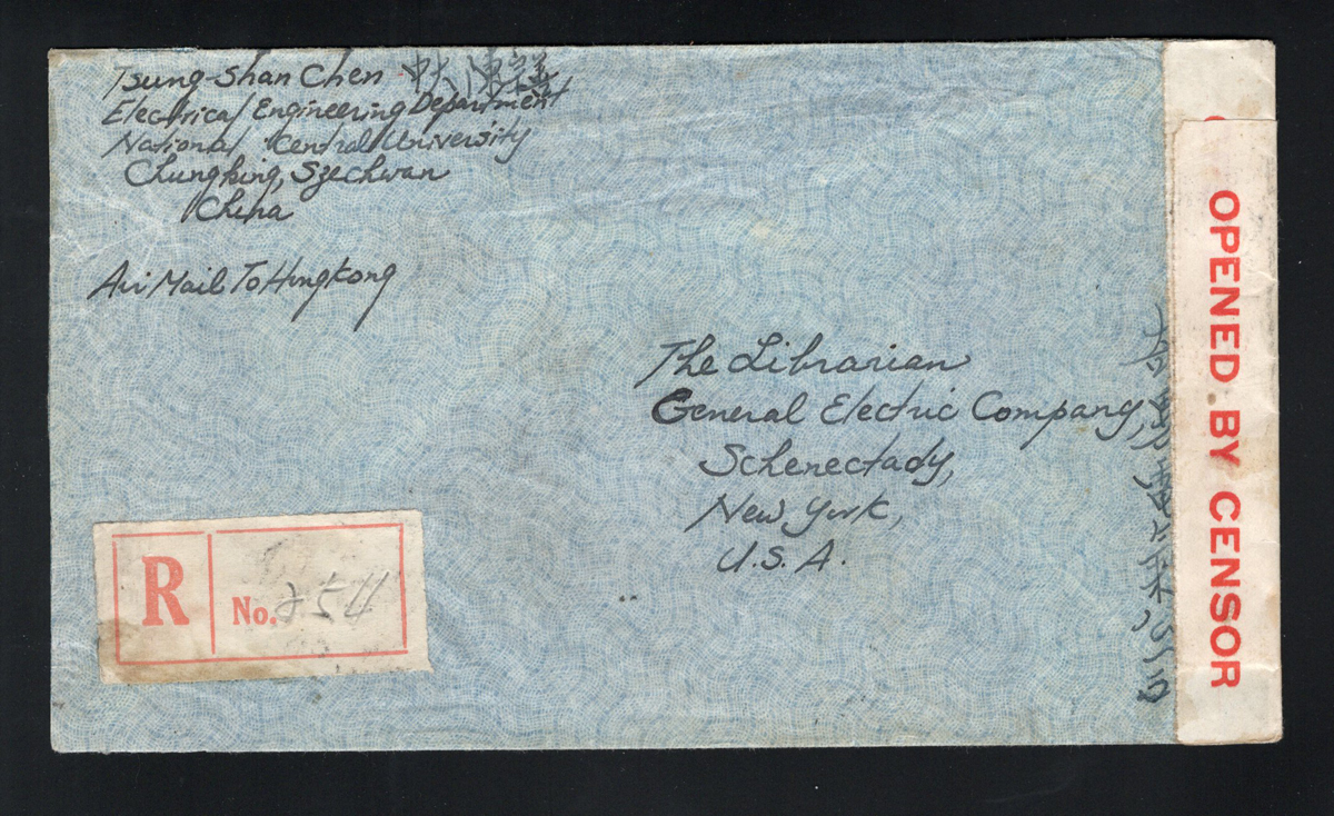 Airmail Registered Cover to the United States, franked with three China stamps (incl. one Airmail) totaling $1.25, all tied to cover by two Chungking unilingual dotted circle cancels, with Air Mail to Hong Kong" endorsement. The cover has a boxed