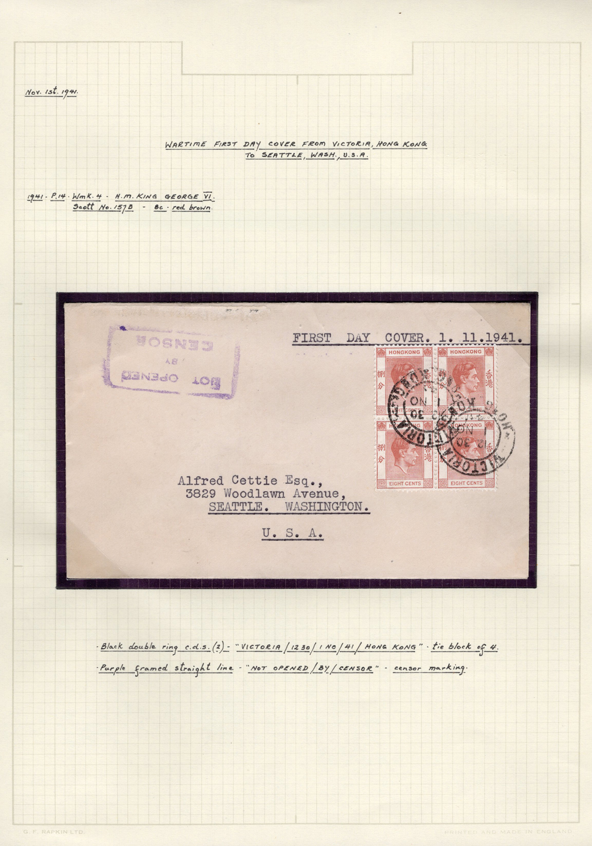 Kong First Day Cover to the United States, an uncacheted cover franked with a block of four of the Hong Kong 8c brown red KGVI issue totaling 32c, all tied to cover by two Victoria / Hong Kong NOV.1.1941 double circle cancels. The cover has a