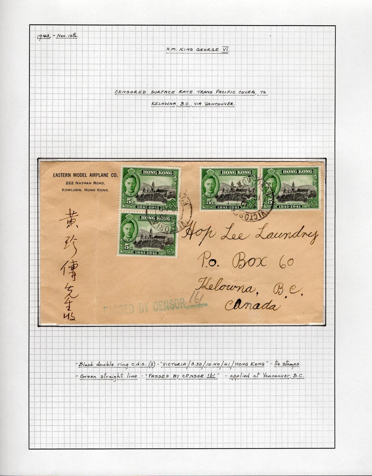 Kong Cover to Kelowna Canada, an unsealed cover franked with four Hong Kong stamps totaling 20c, all tied to cover by two Victoria / Hong Kong NOV.10.1941 double circle cancels. The cover has a boxed "PASSED BY CENSOR ___" single-line handstamp