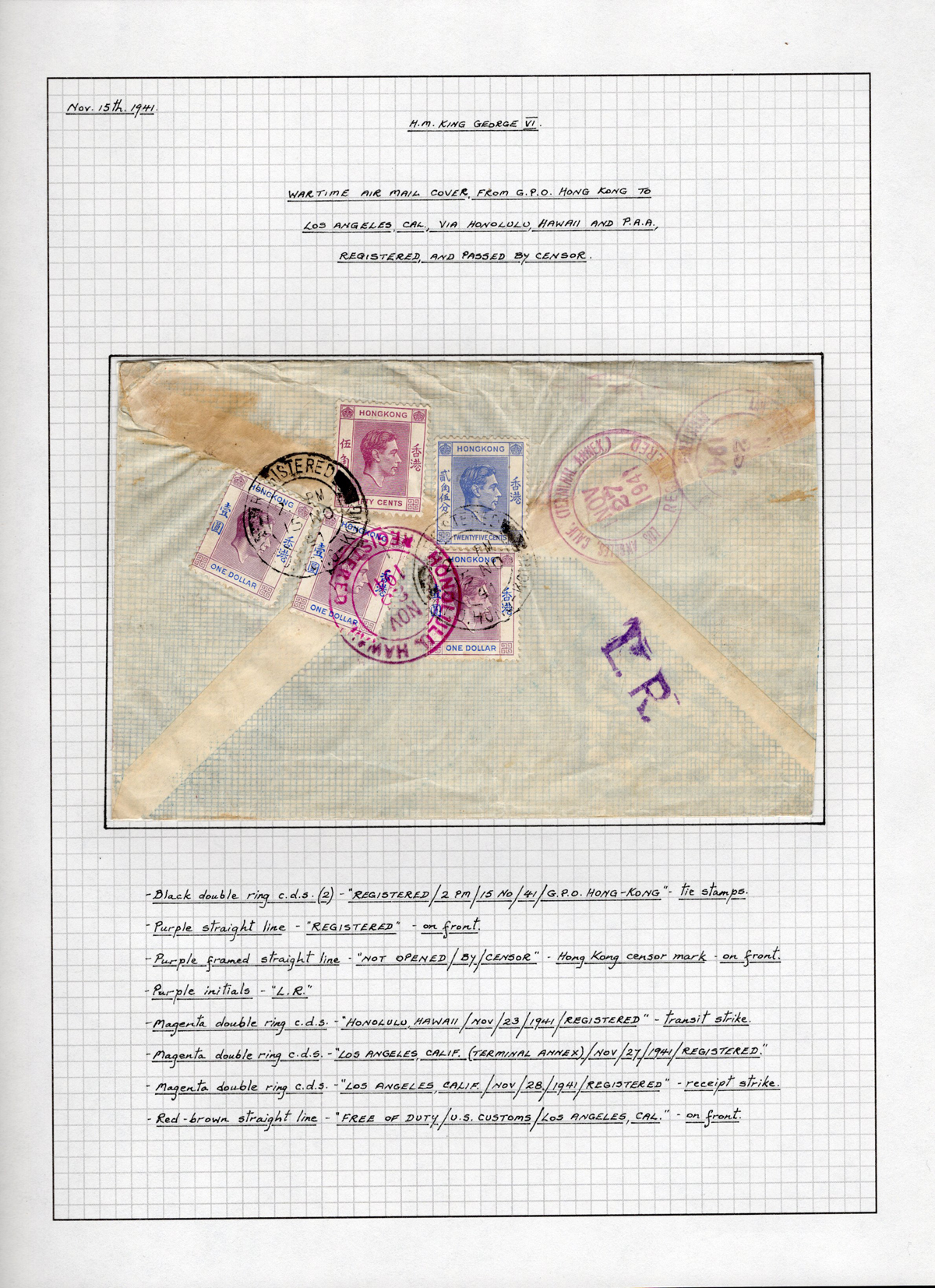 Kong Registered Airmail Cover to the United States, franked with five Hong Kong stamps totaling $3.75, all tied to cover and to themselves by two Registered / G.P.O. Hong Kong NOV.15.1941 double circle cancels. The cover has a boxed "NOT OPENED /
