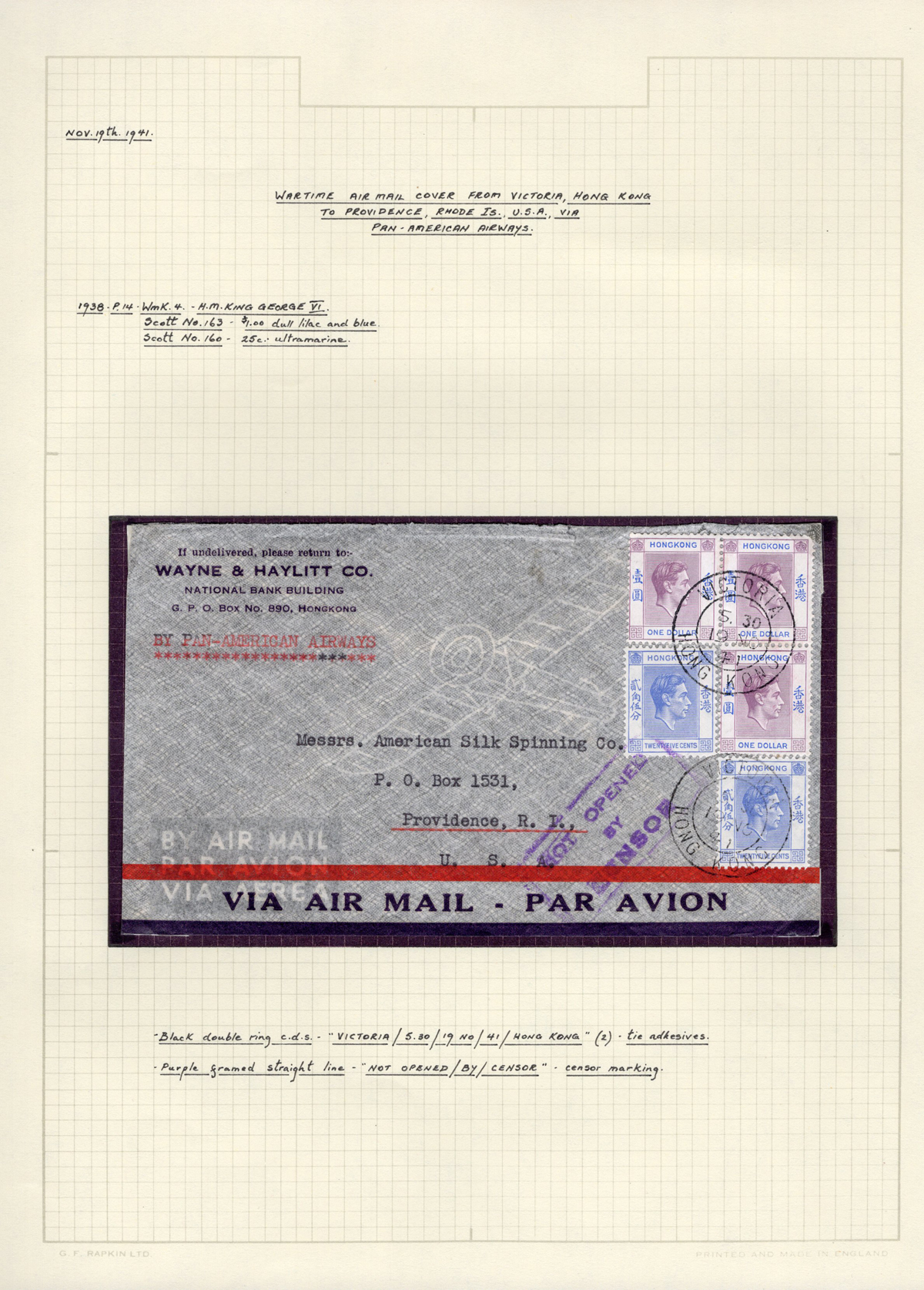 Kong Airmail Cover to the United States, franked with five Hong Kong stamps totaling $3.50, cancelled and tied by two Victoria / Hong Kong NOV.19.1941 double circle cancels, with "Per Pan-American Airways". The cover has a boxed "NOT OPENED / BY