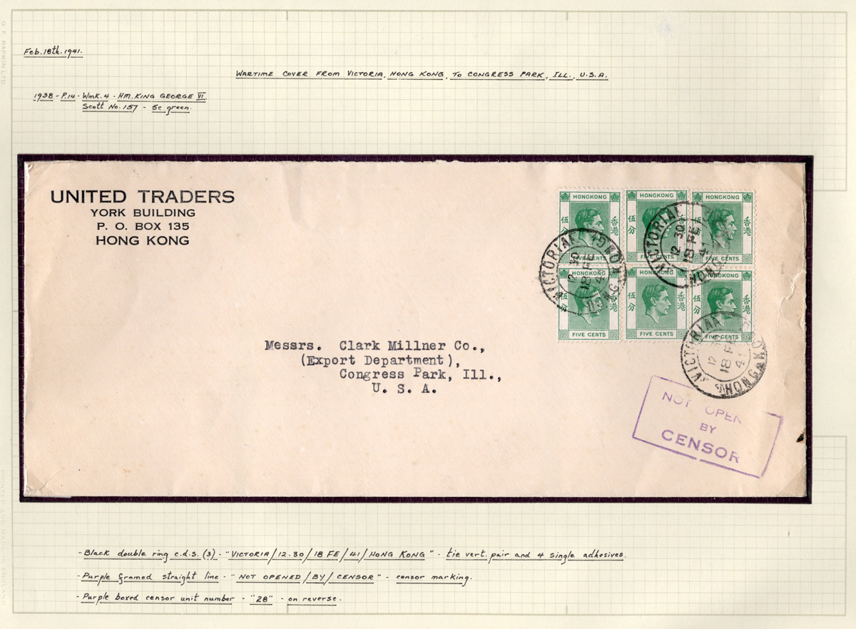 Washington DC, via Victoria / Hong Kong (partial transit), franked with two Hong Kong KGV issues (8c grey and 2c dark green). Cover front only, with light staining, else very fine.