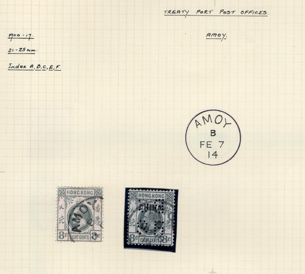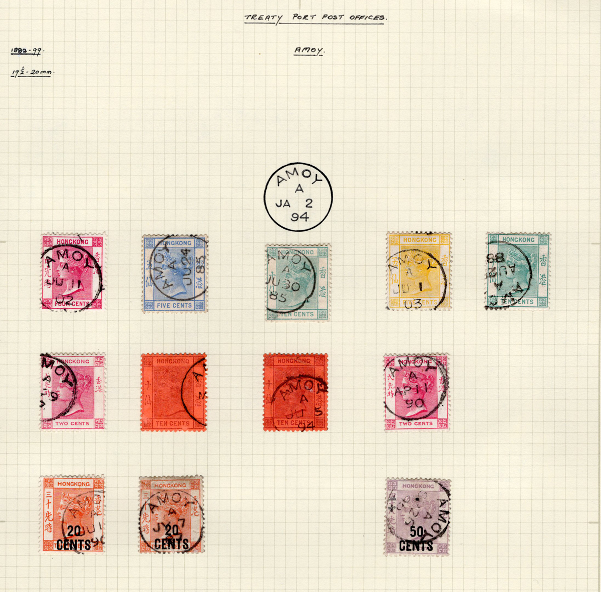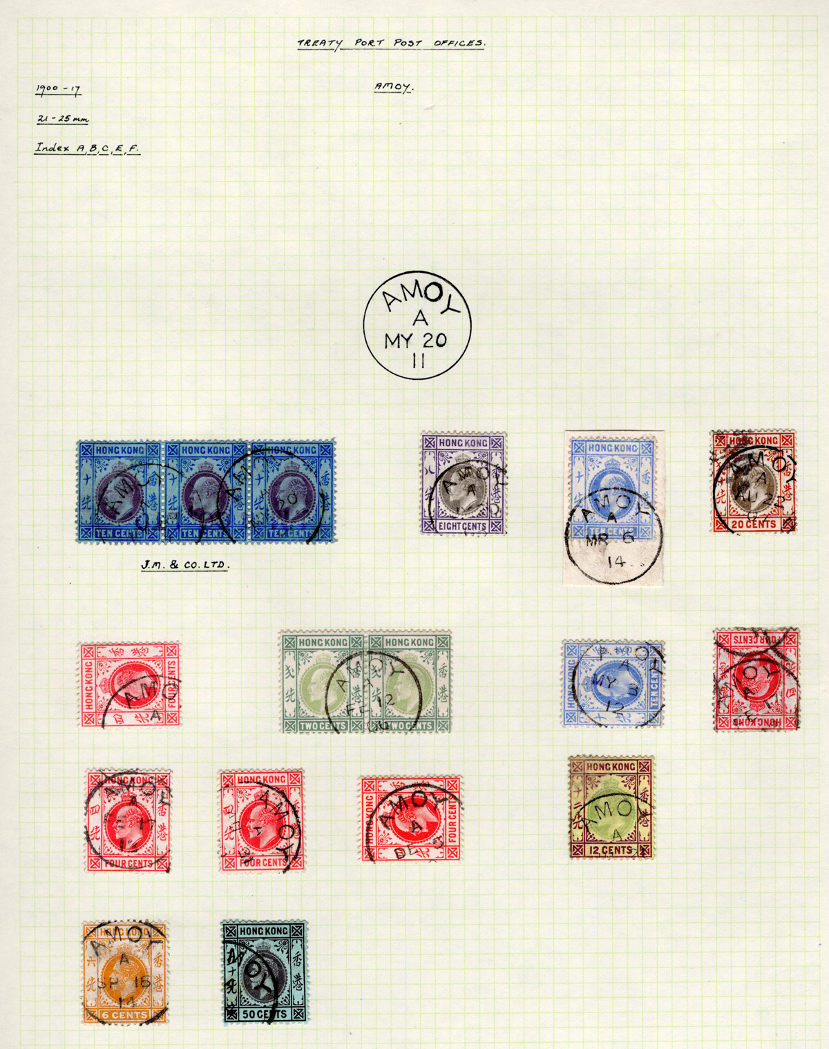 Hong Kong Stamps with Amoy Curved C.D.S. With Index Letters B and C, with Index letter B on two 8c grey KGV stamps and Index letter C on two stamps (10c violet on red QV and 4c carmine KEVII). A scarce and fine group. (Scan 1)