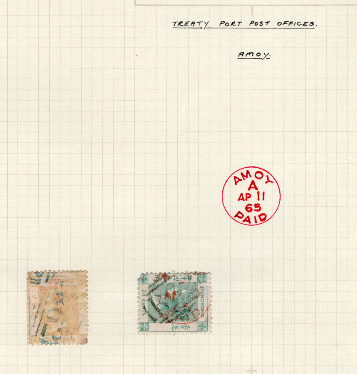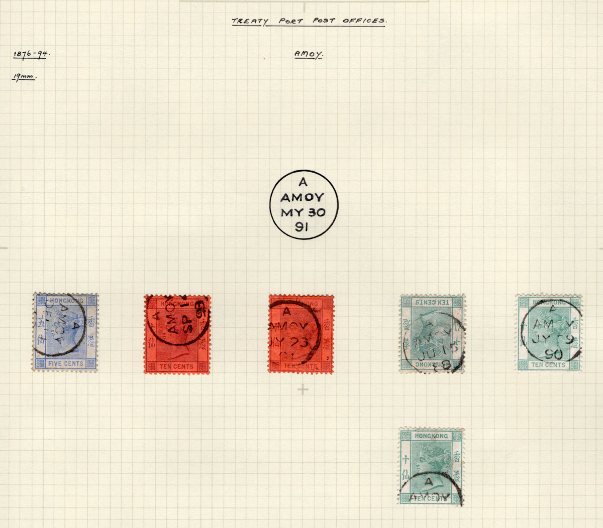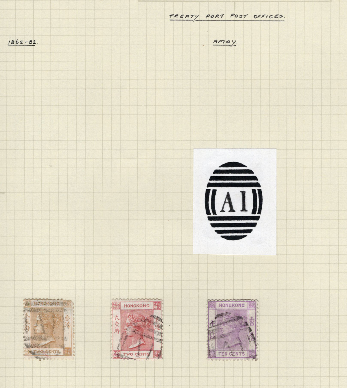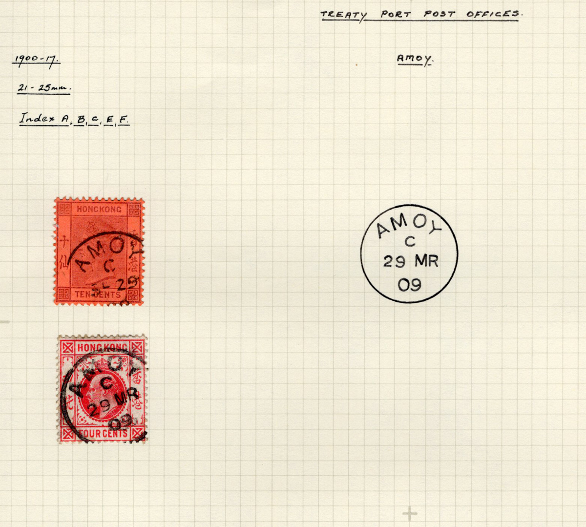 Hong Kong Stamps with Amoy Curved C.D.S. With Index Letters B and C, with Index letter B on two 8c grey KGV stamps and Index letter C on two stamps (10c violet on red QV and 4c carmine KEVII). A scarce and fine group. (Scan 1)