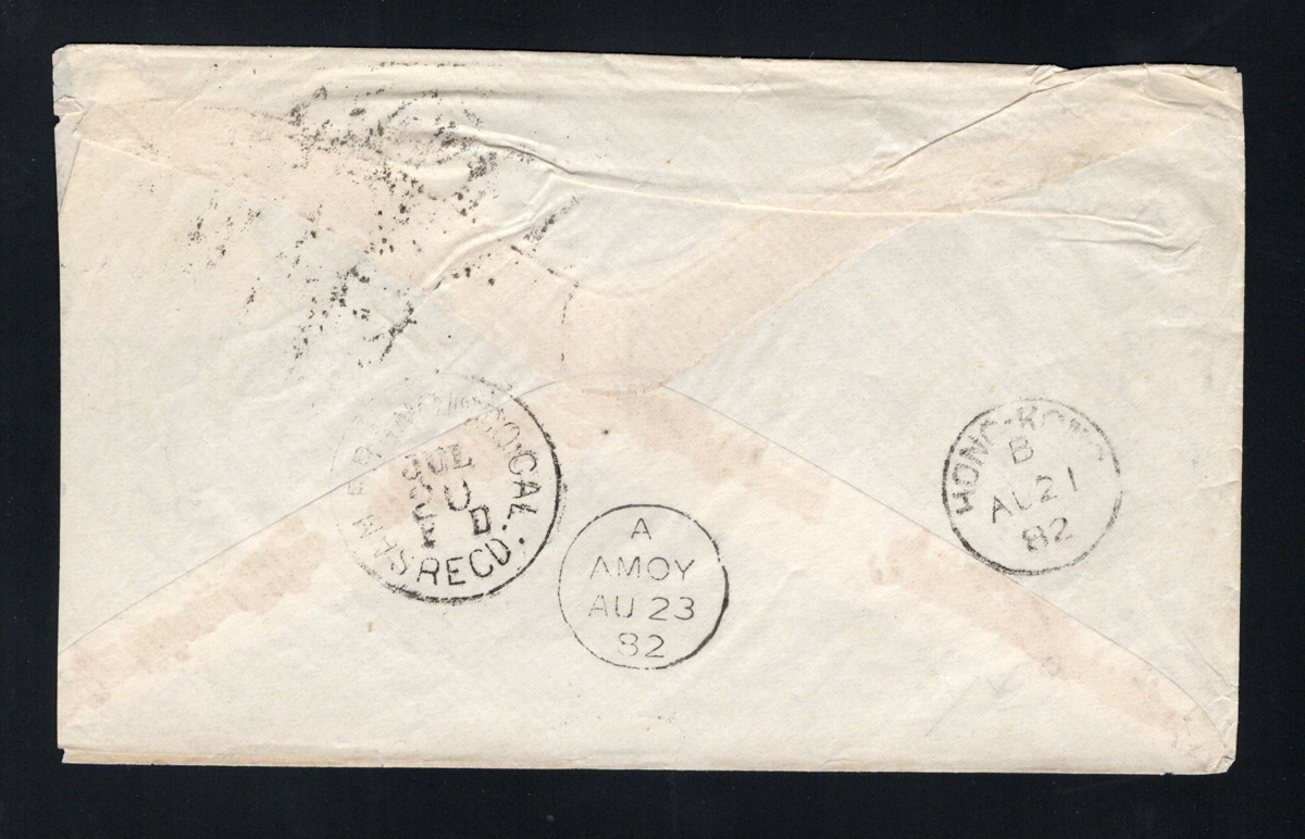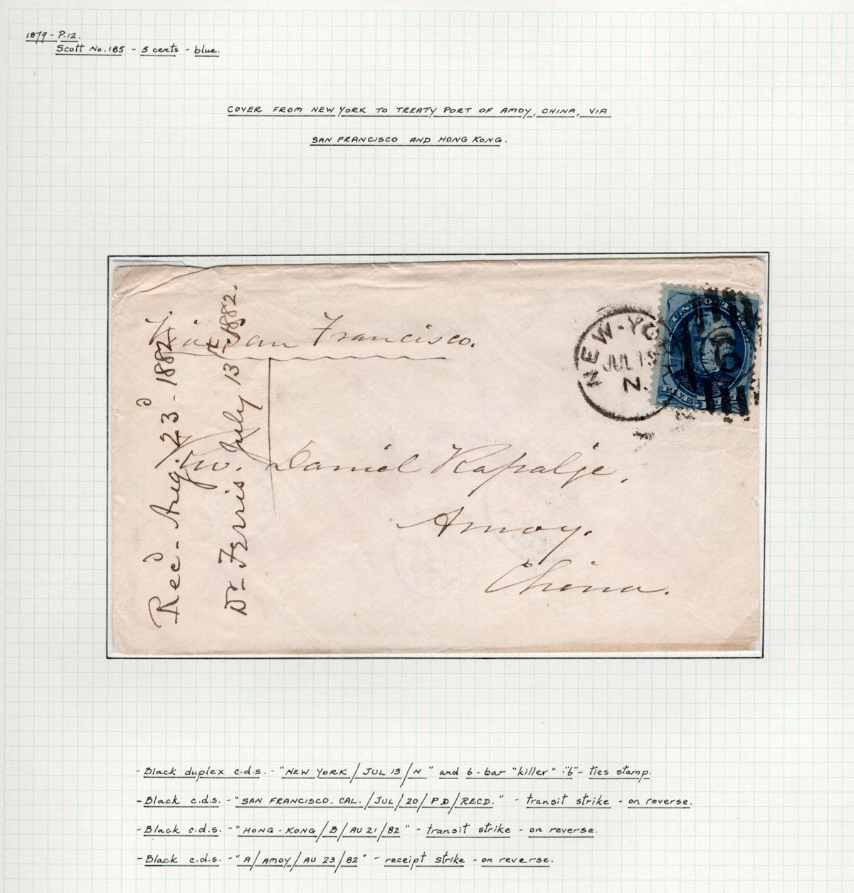 Cover Mailed to Treaty Port of Amoy, China, mailed from New York City on JUL.19 (1882 duplex) and franked with a 5c blue Zachary Taylor issue. Addressed to Amoy, with AUG.23.1883 c.d.s. receiver, via San Francisco (JUL.20 transit) and Hong Kong