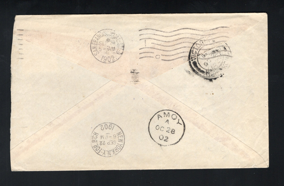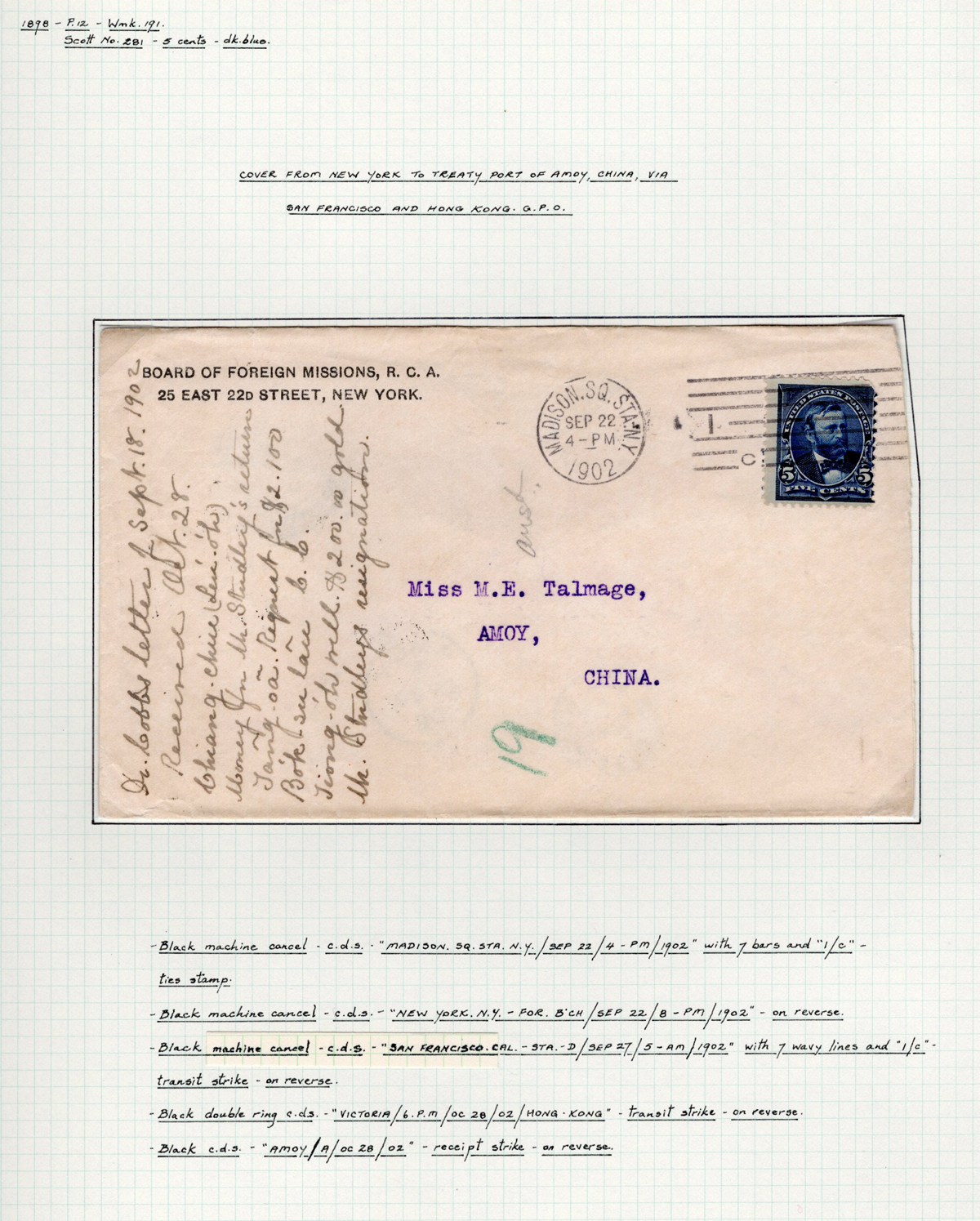 Cover Mailed to Treaty Port of Amoy, China, a “Board of Foreign Missions” cover mailed from New York City on SEP.22.1902 (machine cancel) and franked with a 5c dark blue Grant issue. Addressed to Amoy, with OCT.28.1902 c.d.s. (curved) receiver,