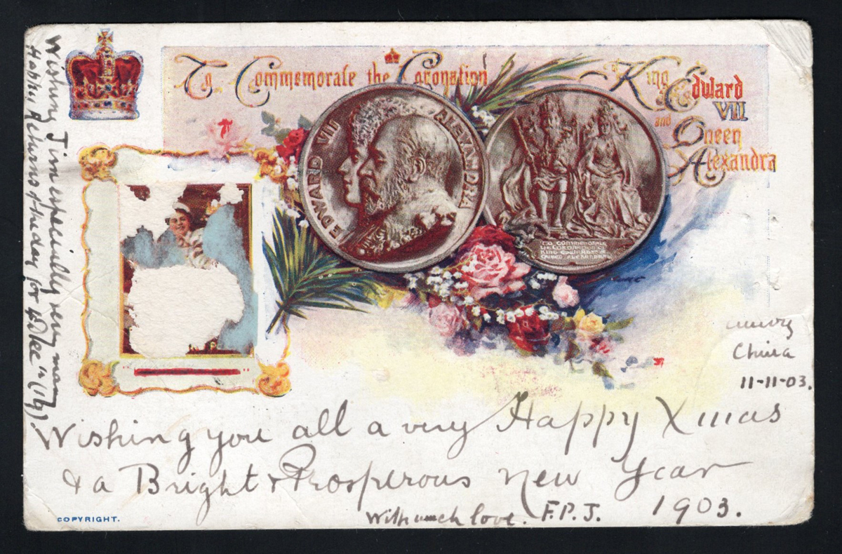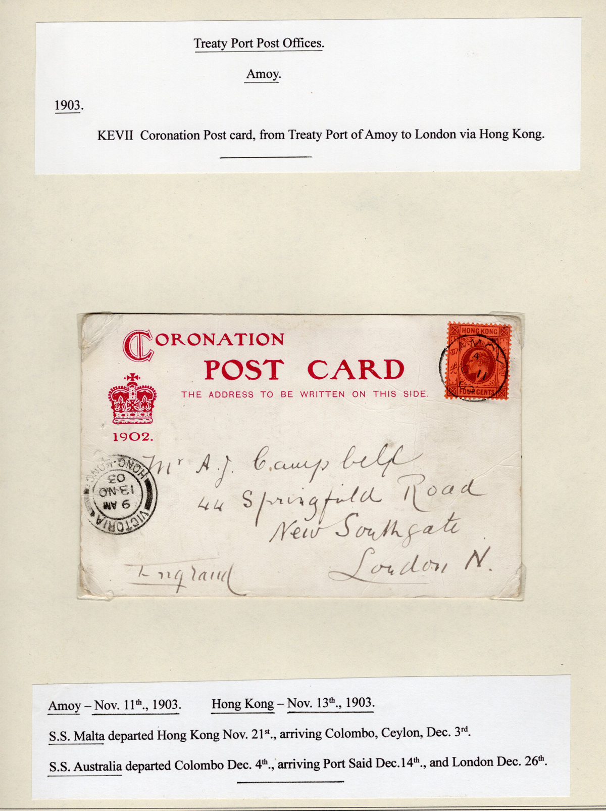 from Amoy China to England, mailed on NOV.11.1903 (curved Amoy c.d.s. ties stamp) to London, England, via Victoria / Hong Kong (NOV.13.1903 transit), franked with a Hong Kong 4c purple on red KEVII issue. According to the accompanying write-up,