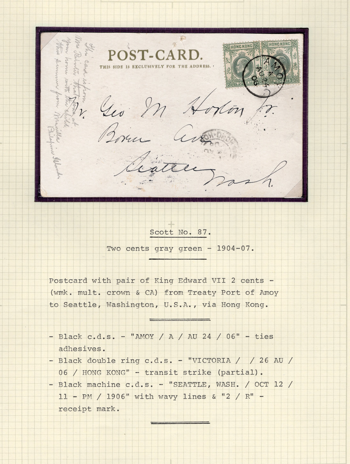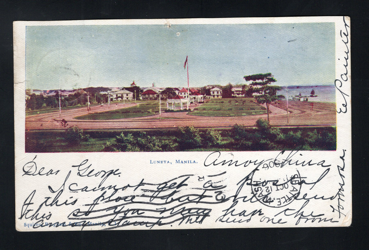 from Amoy, China to the United States, a picture postcard of Luneta, Manila mailed on AUG.24.1906 (curved Amoy c.d.s. ties stamps) to Seattle, Washington (OCT.12 machine receiver), via Victoria / Hong Kong (partial transit), franked with two Hong