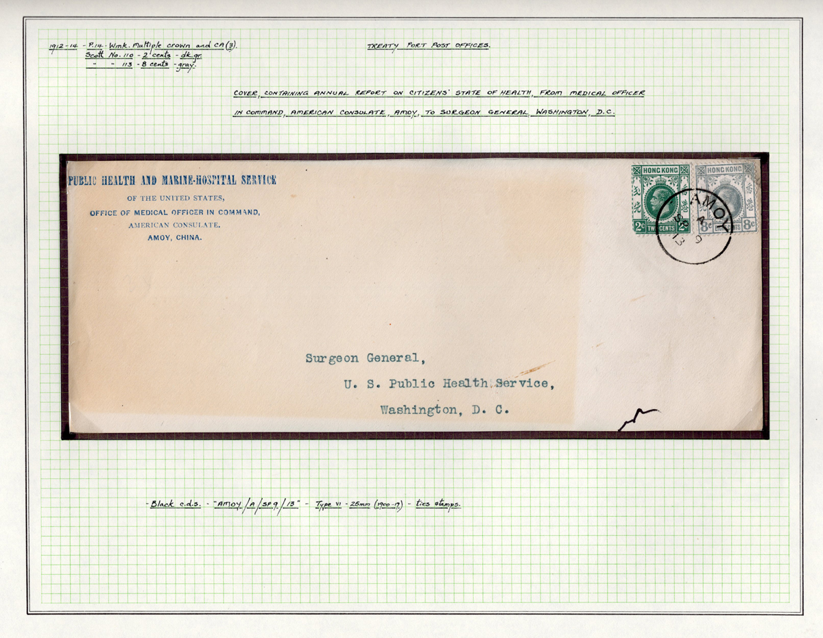 from Amoy, China to the United States, a legal size cover (front only) from the “Public Health and Marine Hospital Service of the United States / American Consulate / Amoy, China” mailed on SEP.9.1913 (curved Amoy c.d.s. ties stamps) to