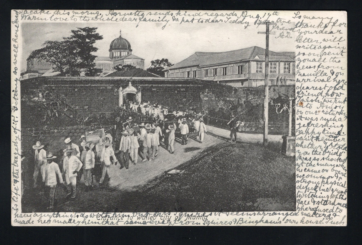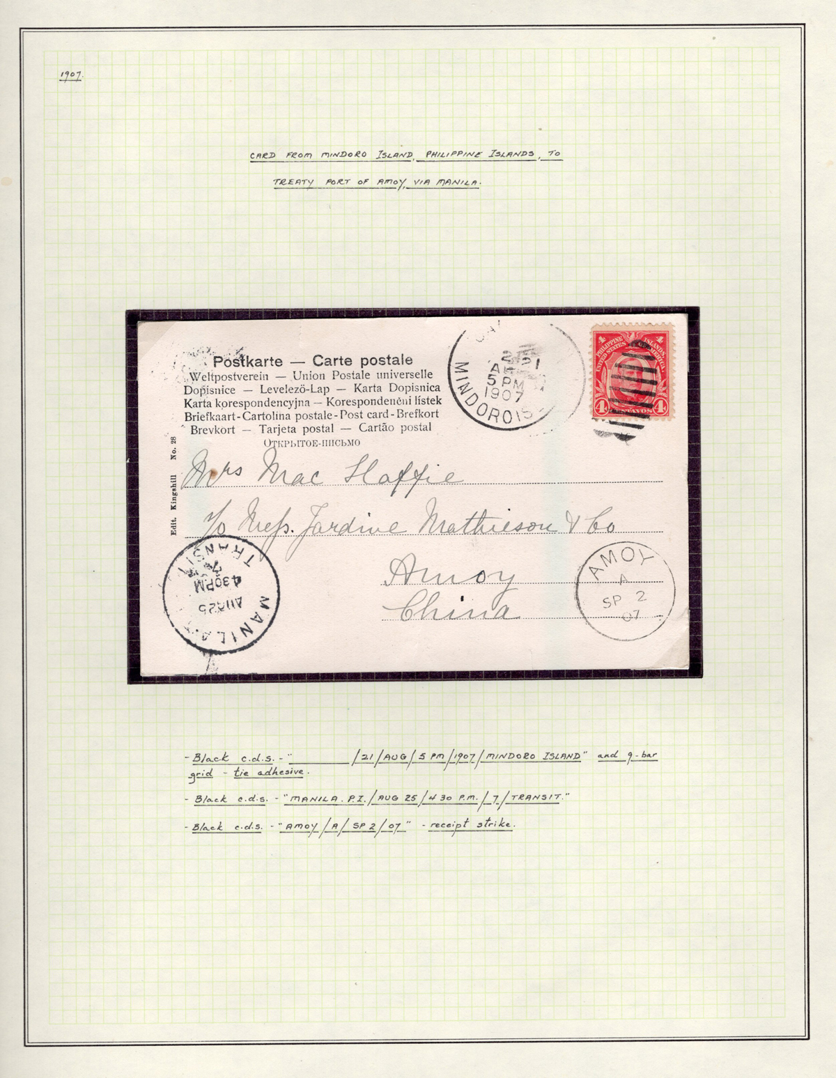 Mailed to Amoy, China from the Philippines, mailed from Mindoro Island on AUG.21.1907 (duplex cancel ties 4c Philippine stamp) to Amoy, China (SEP.2 curved Amoy c.d.s. receiver) through Manila (AUG.25 transit). The picture shows “entrance to