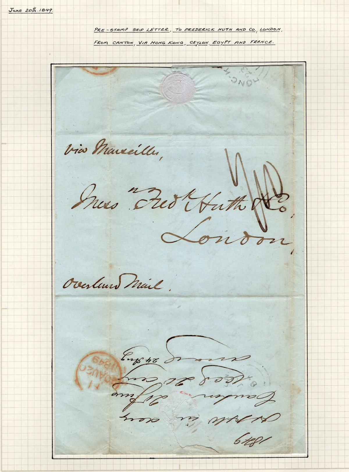 Folded Letter to England, mailed on JUN.20.1849 (dateline of letter inside) to London, England (AUG.20.1849 receiver), via Hong Kong (enhanced JUN.23 transit date stamp), fine. Mounted on two album pages, the second page giving a detailed