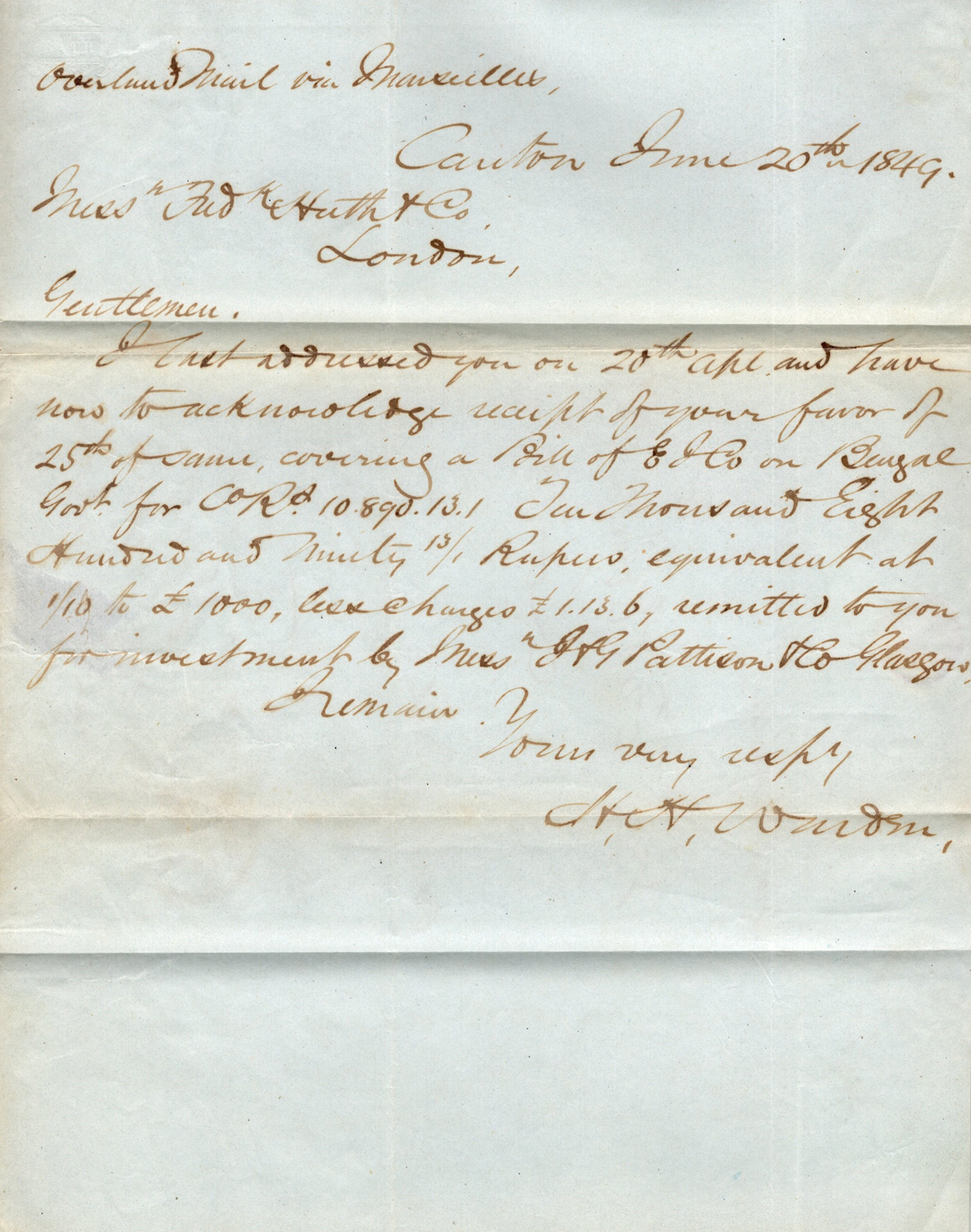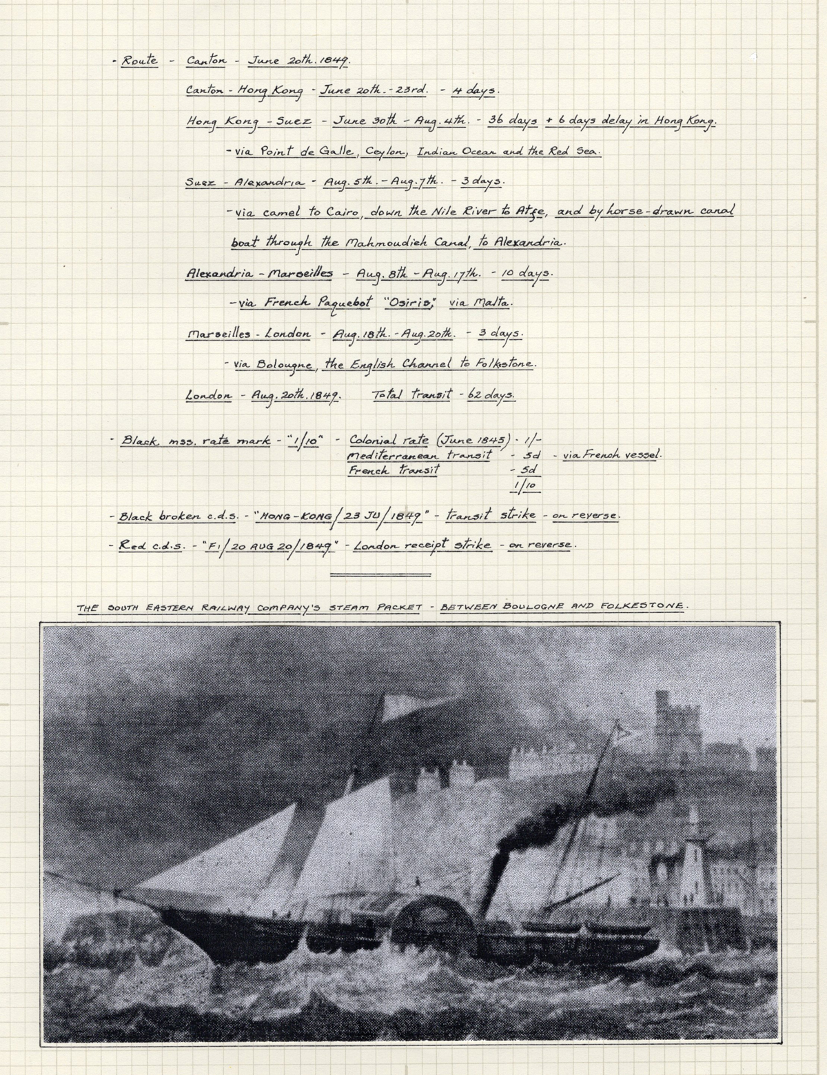 description of its route (which took 62 days total) via the Eastern Railway Company steamer (with image of the steamer). A fine example of early Hong Kong postal history. (Scan