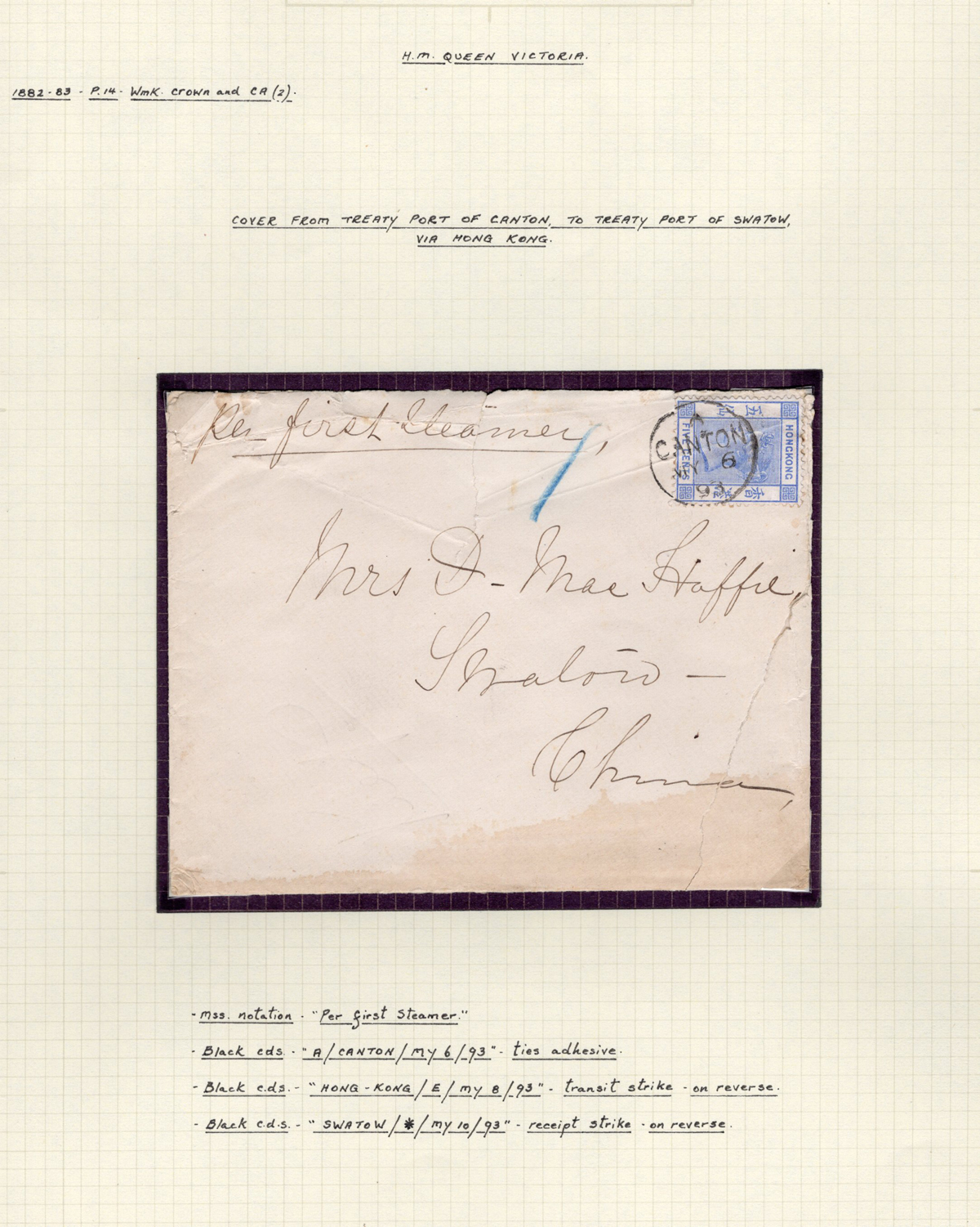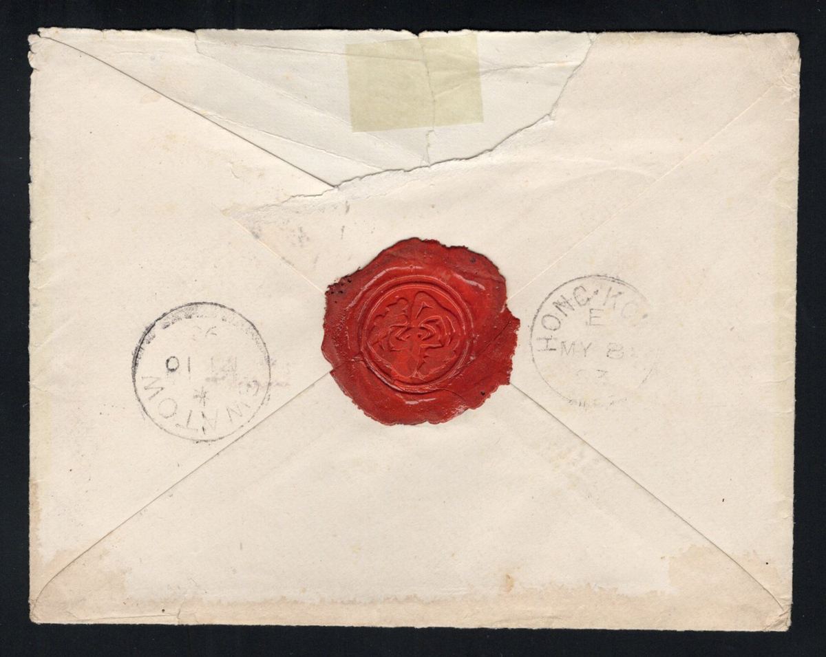 Canton, China to Swatow, China, mailed on MAY.6.1893 (straight c.d.s. cancel ties 5c ultramarine Hong Kong stamp) to Swatow (MAY.10 light receiver on back) through Hong Kong (MAY.8 c.d.s. transit). Several faults, else a fine appearing cover. (Scan 1)