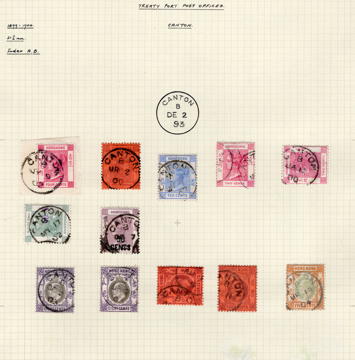 C.D.S. (Curved, with Index Letter B) Cancels on Twelve QV and KEVII Hong Kong Issues, a fine to very fine strike on a variety of issues, overall fine, with several fully dated. Scott catalogue value is $119, SG £106.