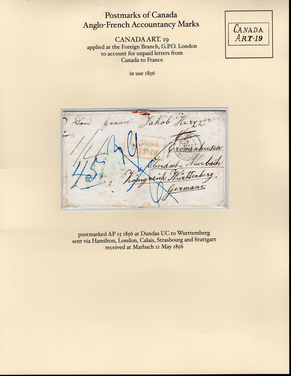 orange boxed "CANADA / ART.19" handstamp was applied at the Foreign Branch, G.P.O. London (these applied on unpaid letters from Canada to France, Montgomery records only 8 examples). Several rate and accountancy markings, very fine.