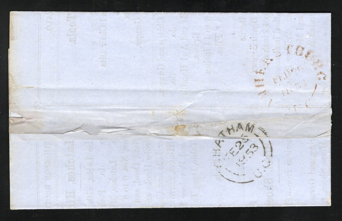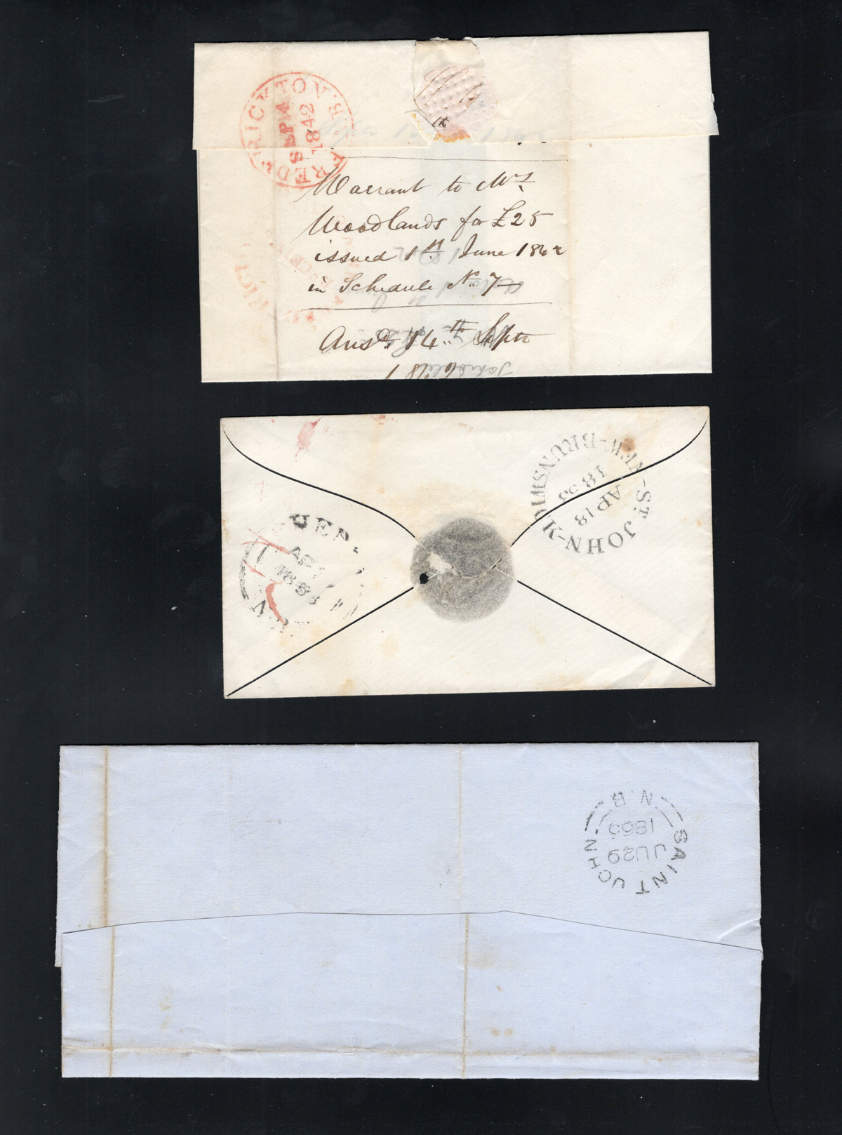 rate, also with a light third Fredericton datestamp on back. Also a small mourning cover with a APR.17.1853 "Fredericton.N.B. / PAID" handstamp in red, also enclosing a manuscript rate to Buctouche, with St John (APR.18) transit on back alongside a