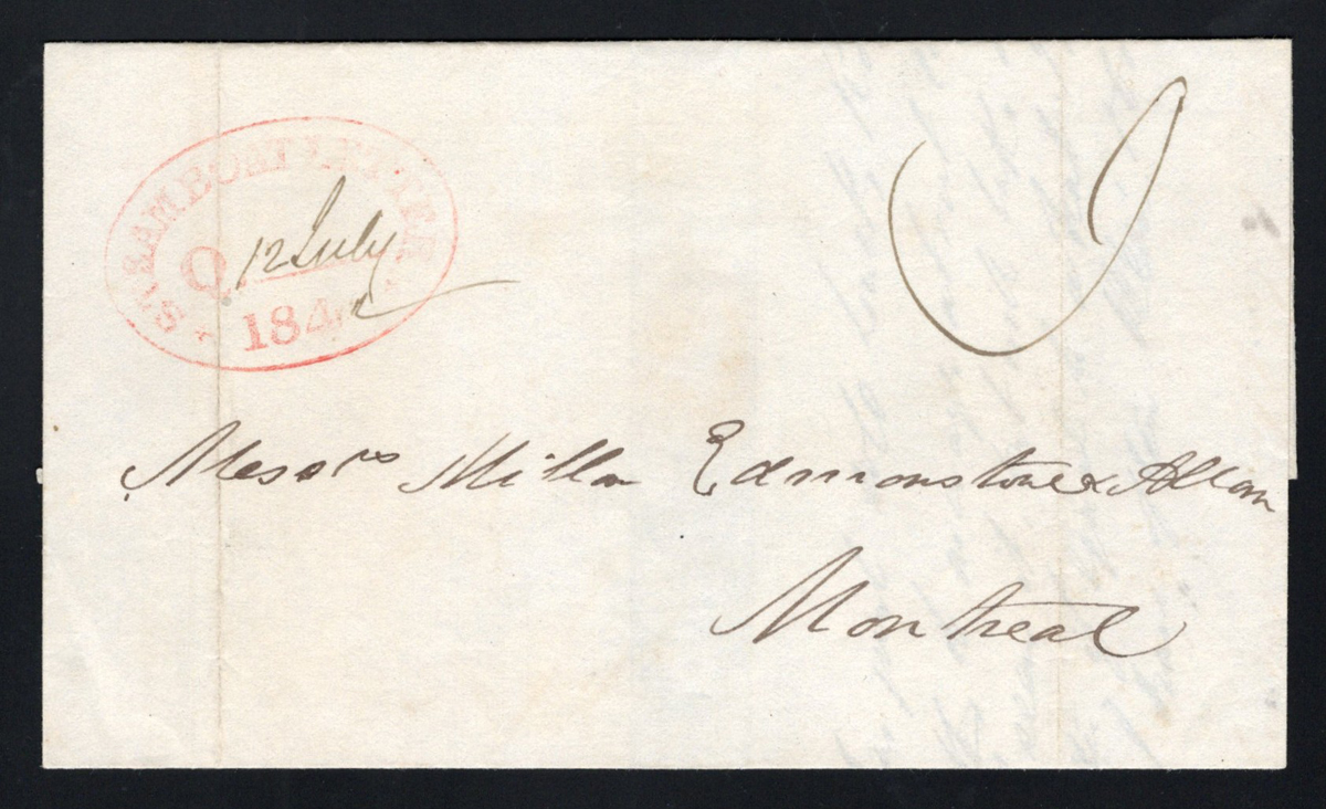 / Q" Oval Postmark, in red, dated JUL.12.1842 on a folded cover addressed to Montréal and rated "9" manuscript. Avery fine and seldom seen postmark.