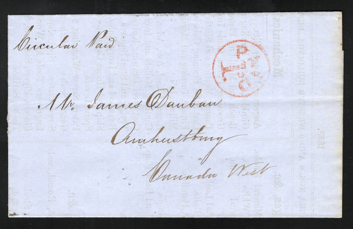 Folded Circular to Amherstburg, mailed on FEB.25.1853 (datestamp on back) to Amherstburg (next day receiver on back), with a scarce "PAID / 1d" in red circle handstamp on front. Fine. (Scan 1)
