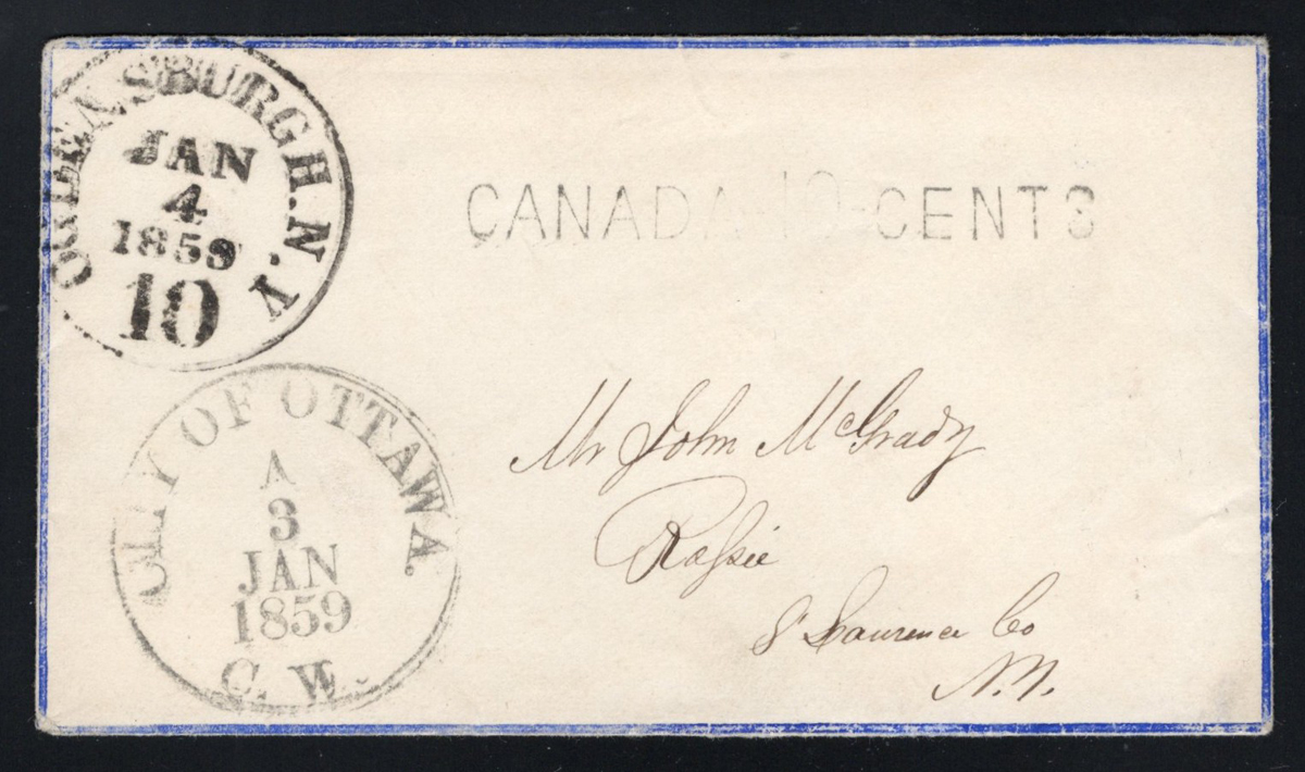 C.W. on Cross Border Cover, mailed on JAN.3.1859 (very fine strike of the double-ring Ruggles / Changeling c.d.s.) to New York State, with "CANADA-10-CENTS" straightline handstamp, bold JAN.4.1859 "Ogdensburgh N.Y. / 10" handstamp on front and