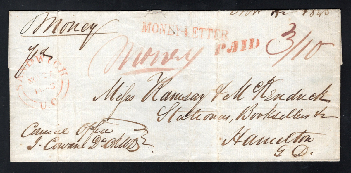 Folded Money Letter to Hamilton, mailed on NOV.17.1845 (double broken circle in red) to Hamilton, unusually without a receiver, but with a red London transit on back dated NOV.19. Endorsed "Money" in manuscript (twice, in black and in red), plus