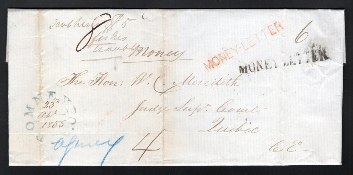 Folded Money Letter to Québec, mailed APR.23.1855 (double broken circle in blue, from the 1831 supplementary order) to Québec (APR.30 receiver) through London (APR.25) and St Thomas (APR.25). Endorsed manuscript "Money" with two different "MONEY