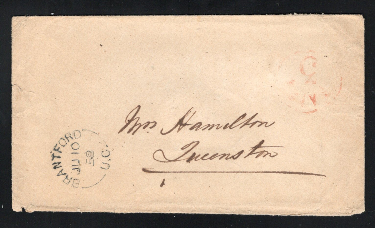 and Paris U.C Early Berri Datestamps on Small Cover, mailed from Brantford on JUN.10.1858 (the earliest recorded date for this instrument) addressed to Queenston (JUN.11 receiver) through Paris (JUN.10). The earliest known date for all of the