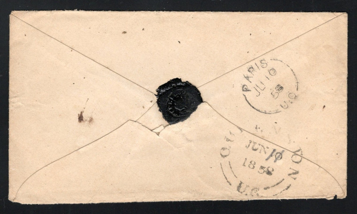 Dundas (U.C.) to Germany, mailed on APR.15.1856 (despatch in green) to Wurttemberg (partial MAY.11 Marbach receiver) through Hamilton (APR.15), London England (MAY.7), Calais (MAY.8), Paris to Strasbourg train (MAY.9), Stuttgart (MAY.11). An