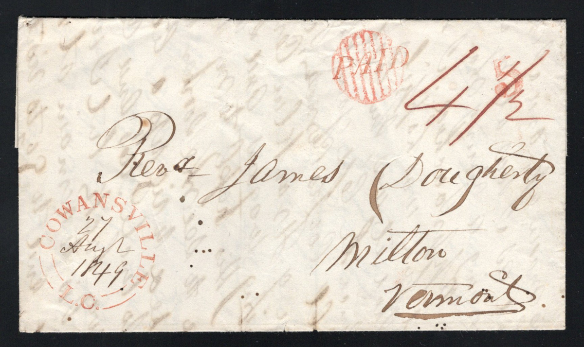 (L.C.) on Cross-Border Folded Letter, mailed on AUG.27.1849 (double broken circle in red) to Milton, Vermont, through St John L.C (AUG.29 c.d.s.) and Montréal (AUG.29) rated 4½, with "PAID" cancelled and replaced with an American "5", very fine.