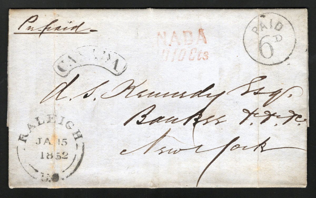 Folded Letter to New York, mailed on JAN.15.1852 (double broken circle in black) to Kennedy in New York City, through Hamilton (JAN.18) and London (JAN.17), endorsed manuscript "Prepaid", with the following three handstamps: "CANADA" in arc (in
