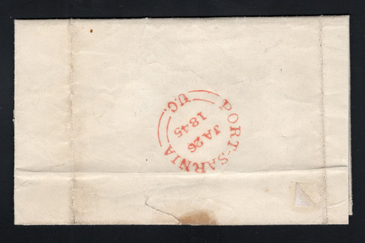 Folded Letter to Port Sarnia, mailed on JAN.20.1845 (small double broken circle in red, from the 1831 supplemental order), with JAN.26 Port Sarnia (very fine large double broken circle in red) receiver on back, very fine. (Scan 1)