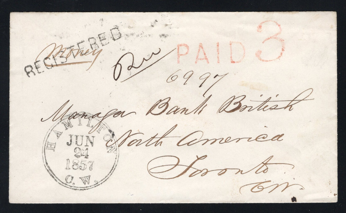 Toronto (next day receiver on back), rated "PAID 3" handstamp in red. Probably the nicest example of this interesting postmark, in this state that we have see, on a very fine cover. Ex Cloutier exhibit. (Scan 1)