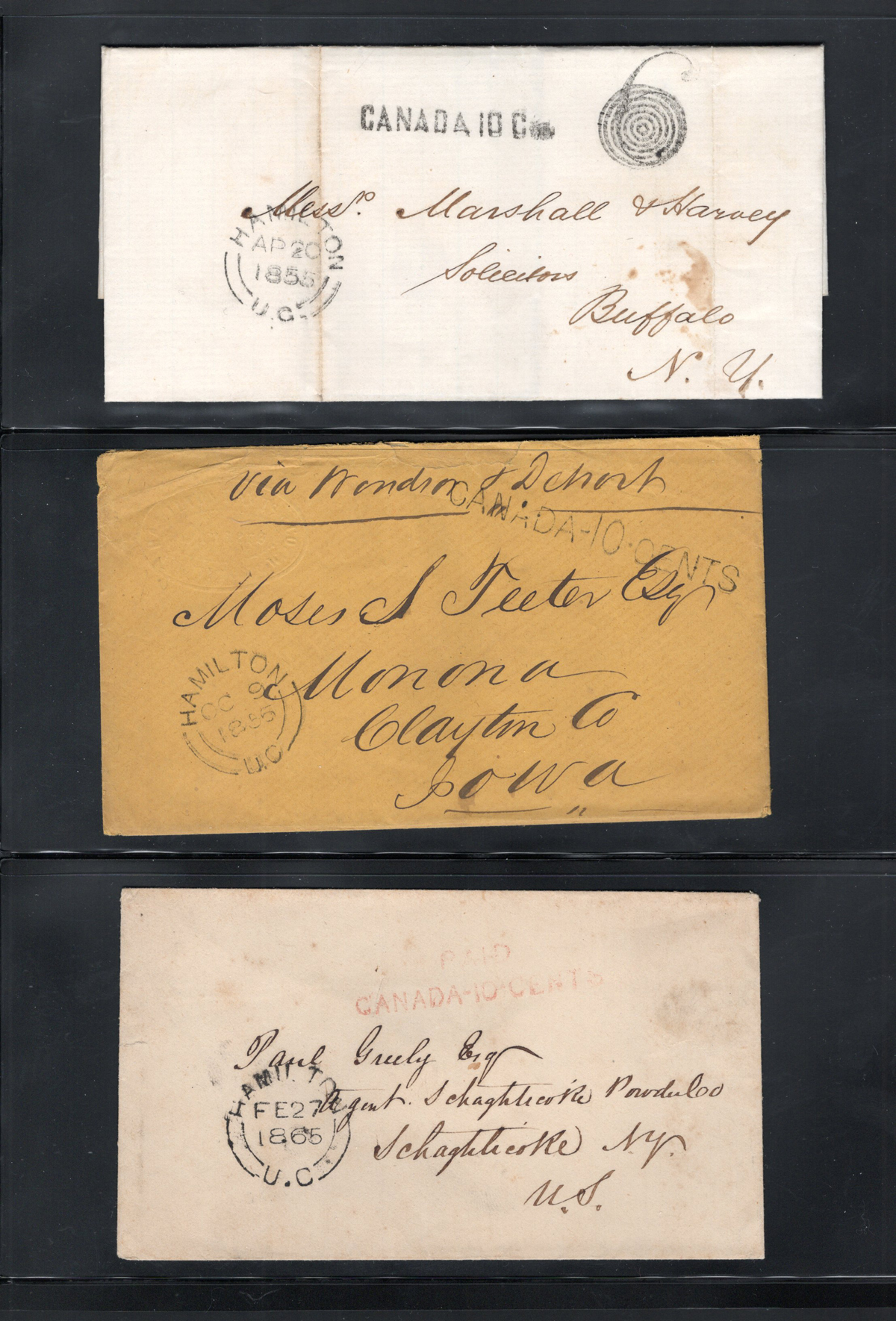 contents to Iowa endorsed "via Windsor & Detroit". FEB.27.1865 "PAID / CANADA-10-CENTS" in red (the latest recorded example) on cover to New York State. All three are very fine and are ex Cloutier exhibit.
