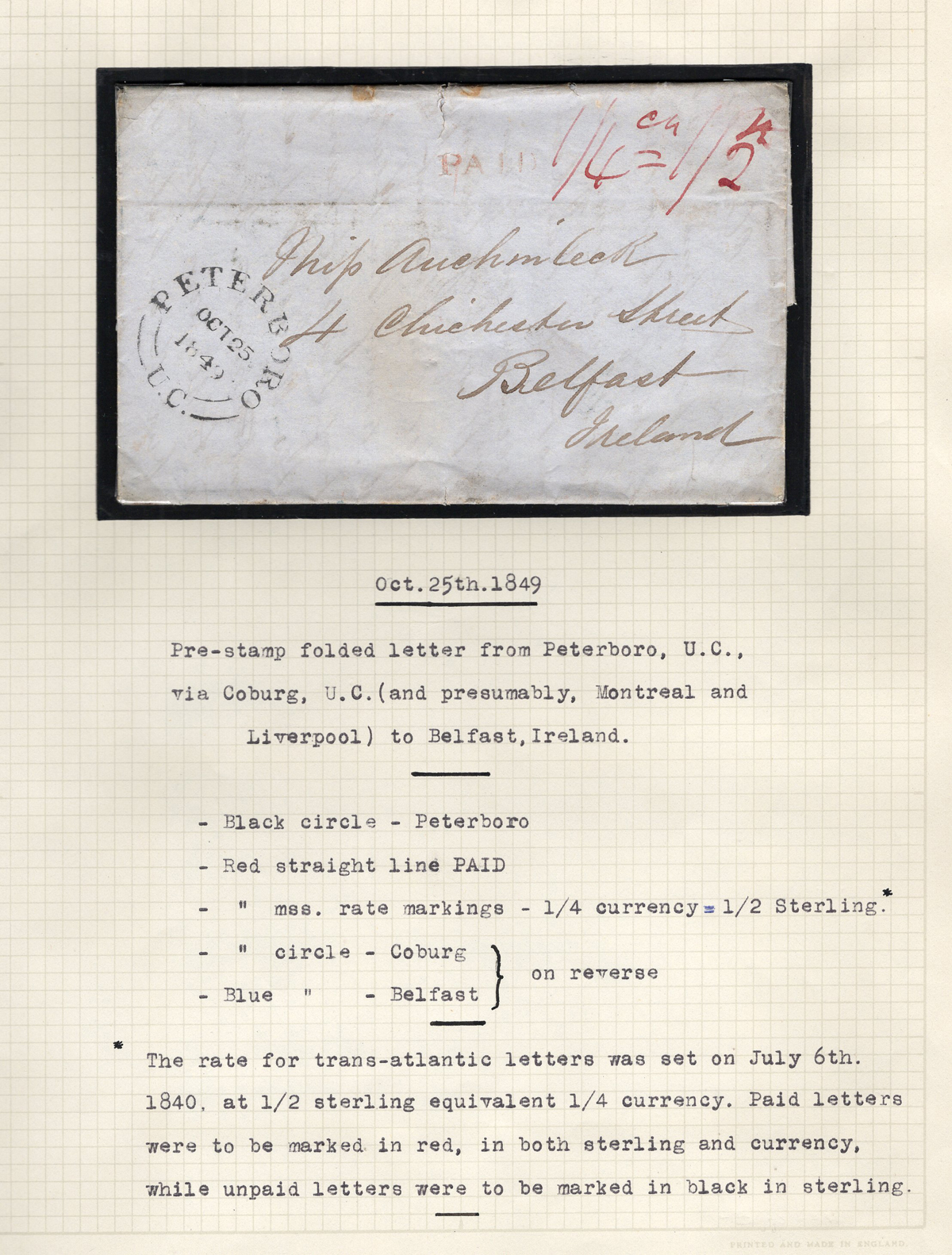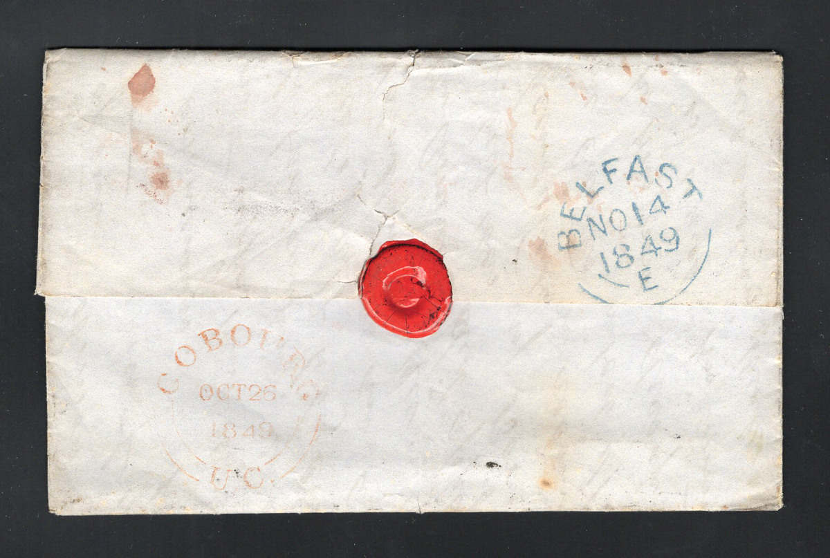 Folded Letter to Ireland, mailed on OCT.25.1849 (dateline inside plus double broken circle despatch datestamp) to Belfast, Ireland (NOV.14.1849 receiver in blue) through Cobourg U.C (OCT.26.1849 transit in red). Rated “PAID” handstamp in red,