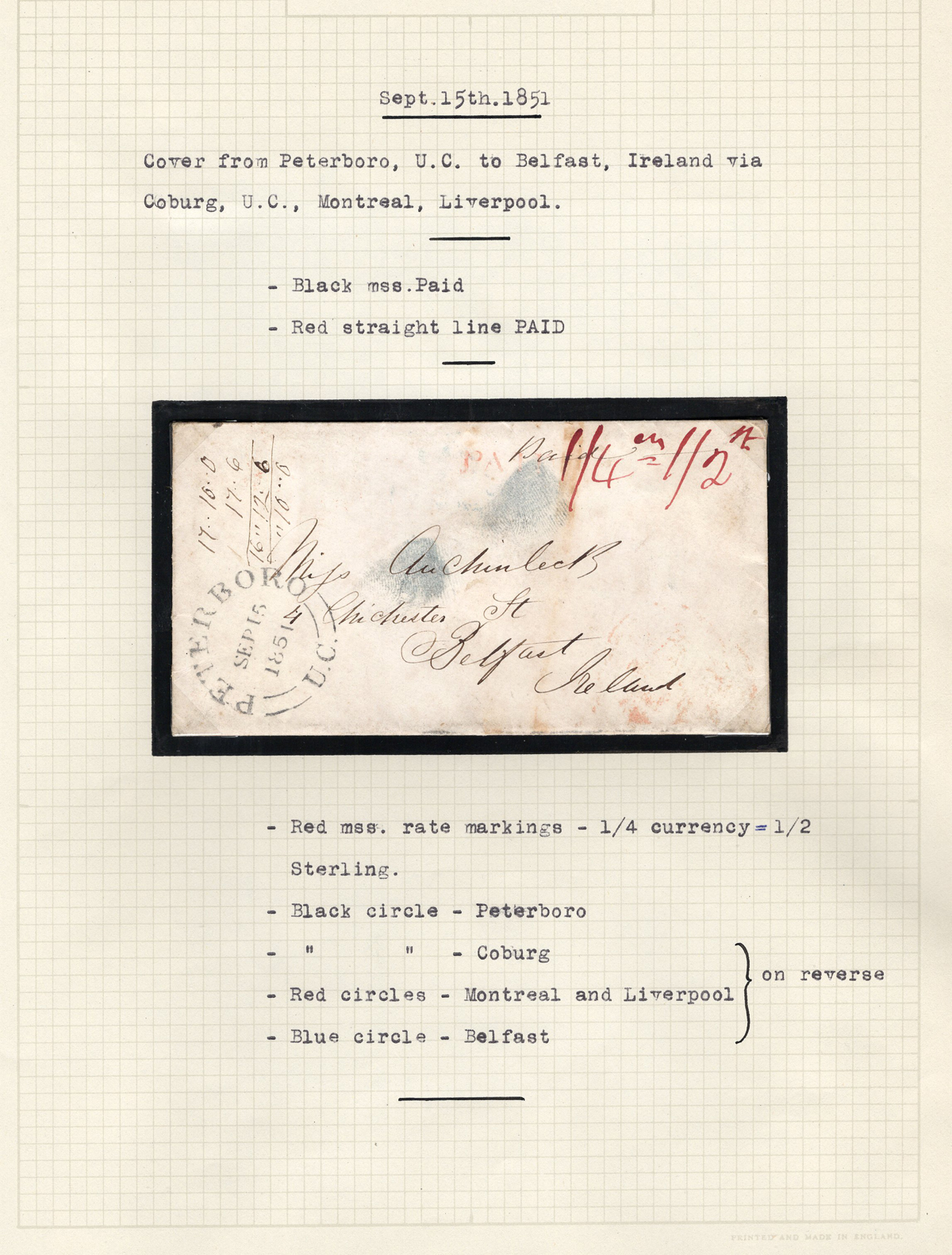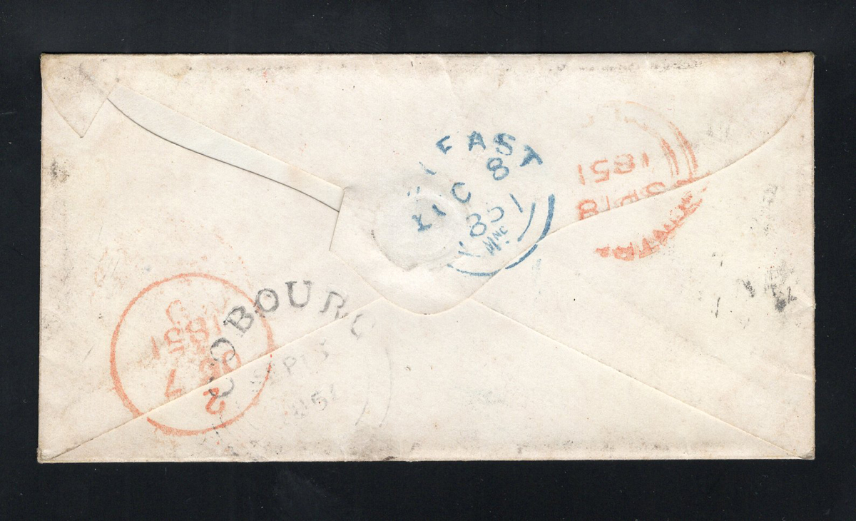 Cover to Ireland, mailed on SEP.16.1851 (double broken circle despatch) to Belfast, Ireland (OCT.8.1851 receiver in blue) via Cobourg (SEP.16 transit), Montreal (SEP.18.1851 transit) and London (OCT.7), rated “PAID” manuscript and handstamp in