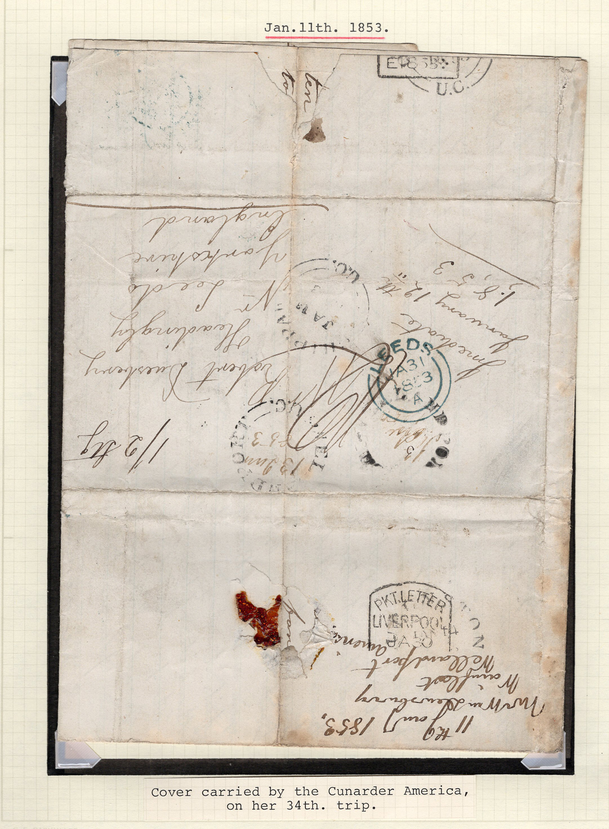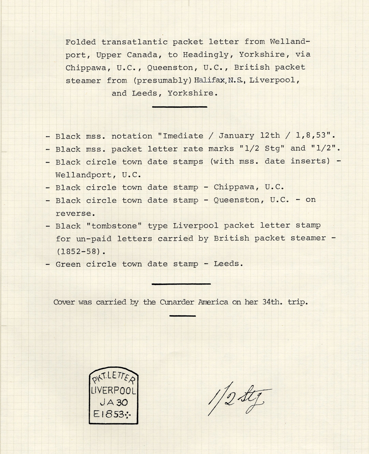 (U.C.) Folded Letter to England, a long 3 page letter written on JAN.11.1853 (datelined Wainfleet Wellandport), to Leeds (JAN.13.1853 receiver in green) through Chippawa UC (JAN.14 transit), Queenston UC (JAN.14 transit) and Liverpool (JAN.30